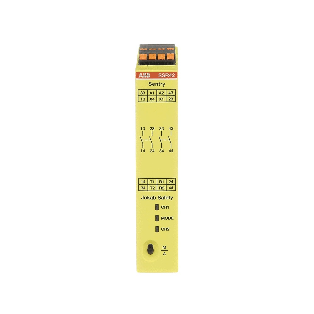 ABB Gerät zur Überwachung von sicherheitsgerichteten Typ Sentry SSR42P Sentry SSR42P Sicherheitsrelais Relaisausgänge 2NO+2NC Die Baureihe Sentry von ABB umfasst das gesamte Spektrum an Sicherheitsrelais, von Basismodellen für einfache Sicherheitsanwendungen oder zur Vervielfachung von Sicherheitsausgängen, bis hin zu hochflexiblen Universalmodellen mit extrem genauen Timerfunktionen. Die Baureihe deckt damit alle Anforderungen an Sicherheitsapplikationen ab. Manueller oder automatischer Reset kann einfach über einen Schalter an der Vorderseite der Relais gewählt werden. Die neue Multi-Reset-Funktion ermöglicht das Zurücksetzen von bis zu 10 Sicherheitsrelais Sentry mit nur einem Reset-Taster. Die Basismodelle BSR sind z.B. für Not-Halt-Abschaltungen oder zur Erweiterung von Sicherheitsausgängen geeignet. Die Einzelfunktionsmodelle SSR eignen sich für Einsatzgebiete wie die Überwachung von Kontakten und OSSD-Signalen oder für Zweihandschaltungen. Die Sicherheitstimer TSR zeichnen sich durch seine sehr hohe Genauigkeit von besser als 1 % aus, und die Universalmodelle USR für alle gängigen Sicherheitsanwendungen bieten zusätzlich Anzeige-und Konfigurationsmöglichkeiten. Hersteller ABB Nr. 2TLA010053R0401 Typ Sentry SSR42P EAN Nr.7350024486308 Warengruppe ABB EPR Produkte