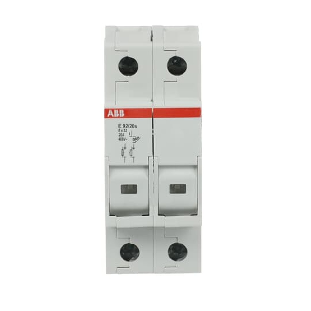 ABB Halter für zylindrische Sicherung Typ E 92/20S Sicherungs-Trennschalter, 2Pol, 20A für Sicherungseinstatz 8,5x31,5mm Sicherungs-Trennschalter für 8,5x31,5 mm Sicherungen zum Schalten unter Last und Schutz gegen Kurzschluss und Überlast. Gehäuse aus selbstverlöschendem Thermoplast mit hoher Temperaturbeständigkeit und Kontaktschellen aus versilbertem Kupfer. E 90 Sicherungs-Trennschalter können plombiert (in geschlossener Stellung) oder abgeschlossen (in offener Stellung) werden. Kompatibel mit Phasenschienen der S 200-Serie kompatibel. Mit Sicherungsbruchanzeige. Hersteller ABB Nr. 2CSM289623R1801 Typ E 92/20S EAN Nr.8012542896234 Warengruppe ABB Einbaugeräte