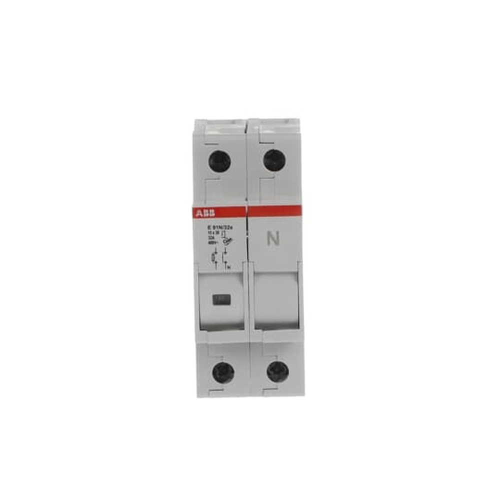 ABB Sicherungs Trennschalter 2CSM251503R1801 Typ E 91N/32s Sicherungs-Trennschalter, 1+N Pol, 32A für Sicherungseinsatz 10,3x38mm AC-22B Sicherungs-Trennschalter für 10,3x38 mm Sicherungen zum Schalten unter Last und Schutz gegen Kurzschluss und Überlast. Gehäuse aus selbstverlöschendem Thermoplast mit hoher Temperaturbeständigkeit und Kontaktschellen aus versilbertem Kupfer. E 90 Sicherungs-Trennschalter können plombiert (in geschlossener Stellung) oder abgeschlossen (in offener Stellung) werden. Kompatibel mit Phasenschienen der S 200-Serie kompatibel. Mit Sicherungsbruchanzeige. Hersteller ABB Nr. 2CSM251503R1801 Typ E 91N/32s EAN Nr. Warengruppe ABB Einbaugeräte