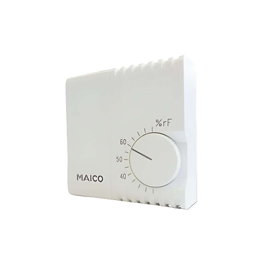 Der Maico Hygrostat zur Steuerung von Ventilatoren in Abhängigkeit der relativen Luftfeuchte. Der Maximalstrom (bei cos phi=1) 8 A bzw. (bei cos phi=0,6) 4A. Der Maico Hygrostat hat ein stufenlosn Einstellbereich: 20 % bis 95 % relative Luftfeuche. Feineinstellung im Komfortbereich bei 45 % bis 65 % relative Luftfeuchte. Schalthysterese: ca. 2 % relative Luftfeuchte. Damit der angeschlossene Ventilator nicht ununterbrochen läuft, wechselt der Hygrostat nach ca. 1 h in den Standby-Betrieb. Damit wird der Ventilator für ca. 4 h abgeschaltet.