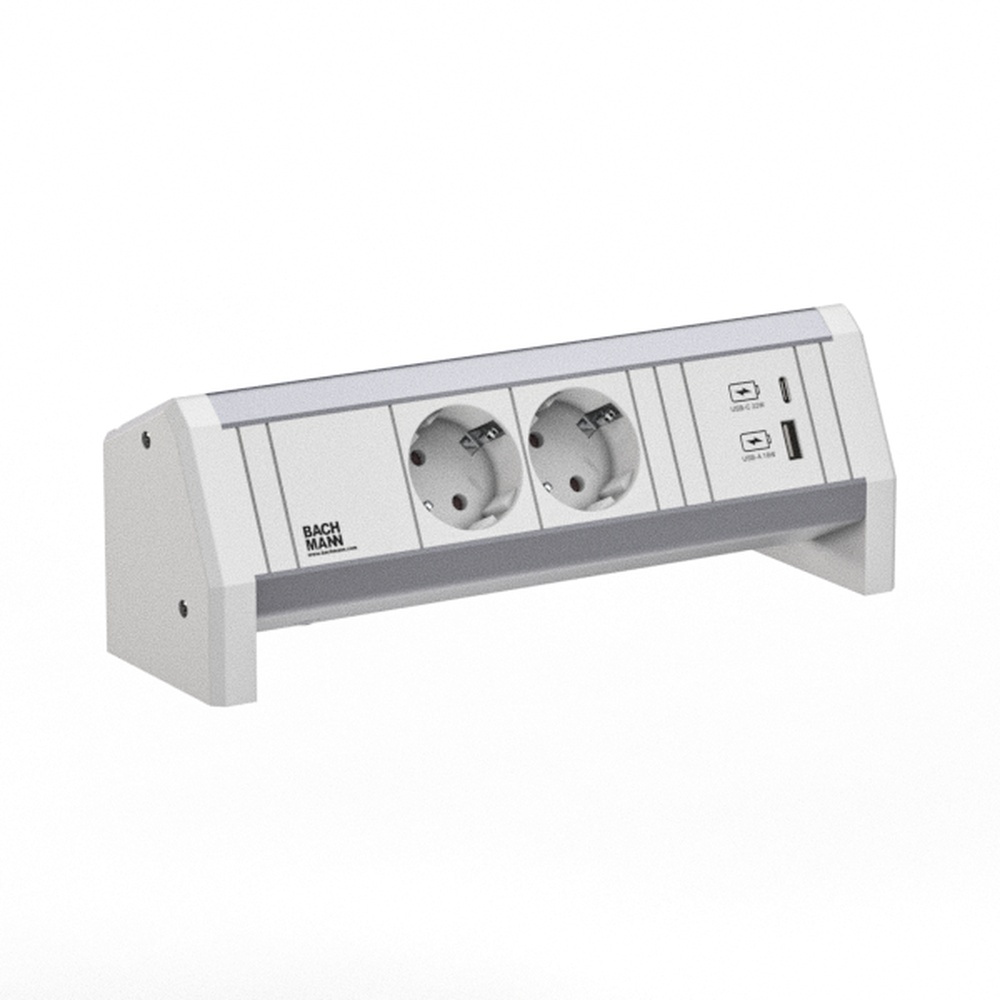 Bachmann Steckdosenleiste 902.0295 DESK ALU Steckdosenleiste eloxiert 2xUTE Steckdosen Frankreich 35 Grad weiß 1xUSB A/C 22W Charger Kunststoffkomponenten weiß ähnlich RAL9010 Stromeingang und -ausgang GST18 weiß mit BACHMANN Logo verpackt im Karton Hersteller Bachmann Nr. 9020295 EAN Nr. 4057298136085 Warengruppe Bachmann Steckdosenleiste