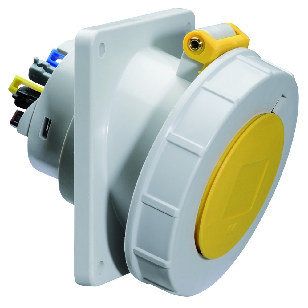 Bals Anbausteckdose 12852 Anbausteckdose Quick-Connect geneigt 32A 5p (3P+N+PE) 110V (57/100 bis 75/130V) 4h IP67 50 und 60Hz, Kennfarbe gelb RAL 1012, Flansch- und Befestigungsmaß Flansch 100x92 mm (HxB), Befestigung 85x77 mm (HxB), Kontaktträger/Kontakte Kontaktträger aus Polyamid, die Kontakte sind aus Messing, Maximaler Leiterquerschnitt 10,0 qmm, Gehäusematerial Polyamid, Sonstige technische Eigenschaften Die Neigung beträgt 20 Grad. Typ 12852 EAN Nr. 4024941128520 Warengruppe Bals Anbausteckdosen