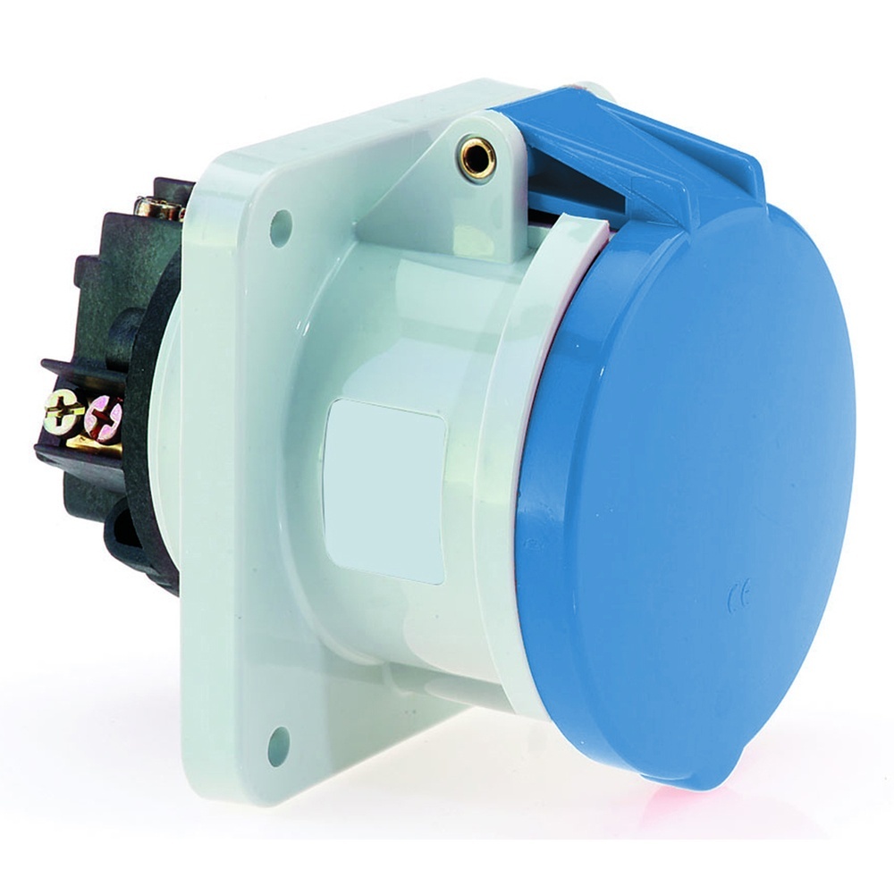 Bals Anbausteckdose 1307 Anbausteckdose gerade 63A 3p (2P+PE) 230V (200 bis 250V) 6h IP44 50 und 60Hz, Kennfarbe blau RAL 5015, Flansch- und Befestigungsmaß Flansch 107x100 mm (HxB), Befestigung 85x77 mm (HxB), Kontaktträger/Kontakte Kontaktträger aus Polyamid, die Kontakte sind Messing vernickelt, Maximaler Leiterquerschnitt 25,0 qmm, Gehäusematerial Polyamid Typ 1307 EAN Nr. 4024941013079 Warengruppe Bals Anbausteckdosen