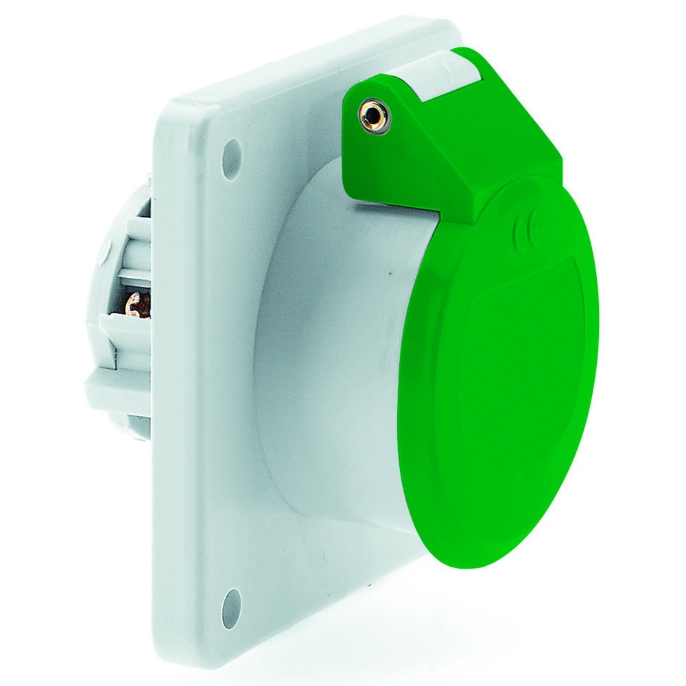 Bals Anbausteckdose 4374 Kleinspannungs-Anbausteckdose gerade 32A 3p (3P) 50V (20 bis 25 und 40 bis 50V) 2h IP44 300Hz, Kennfarbe grün RAL 6002, Flansch- und Befestigungsmaß Flansch 75x75 mm, Befestigung 60x60 mm, Kontaktträger/Kontakte Kontaktträger aus Polyamid, die Kontakte sind Messing vernickelt, Maximaler Leiterquerschnitt 10,0 qmm, Gehäusematerial Polyamid Typ 4374 EAN Nr. 4024941043748 Warengruppe Bals Anbausteckdosen