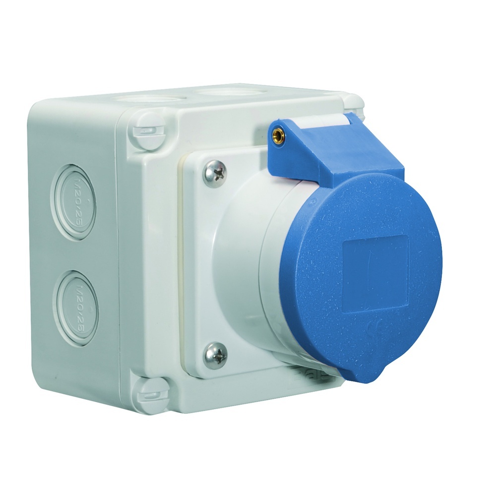 Bals Wandsteckdose 110553 Wandsteckdose Quick-Connect 32A 4p (3P+PE) 230V (200 bis 250V) 9h IP44 50 und 60Hz, Kennfarbe blau RAL 5015, Gehäusegröße 102x102 mm (HxB), Kontaktträger/Kontakte Kontaktträger aus Polyamid, die Kontakte sind aus Messing, Maximaler Leiterquerschnitt 10,0 qmm, Gehäusematerial Copolymer Polyamid, Kabeleinführung 3 Seiten je 2x M20/25, 1 Seite je 1x M20/25 zum Ausbrechen Typ 110553 EAN Nr. 4024941938495 Warengruppe Bals Wandsteckdose