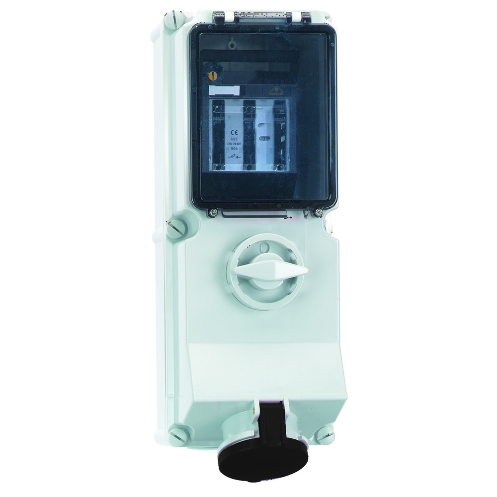 Bals Wandsteckdose 17335 Wandsteckdose abschaltbar abgesichert 63A 4p (3P+PE) 500V (480 bis 500V) 7h IP44 50 und 60Hz, Kennfarbe schwarz RAL 9005, Gehäusegröße 460x180 mm (HxB), Kontaktträger/Kontakte Kontaktträger aus hochwärmebeständigem Material, die Kontakte und Rahmenklemmen sind aus Messing, Maximaler Leiterquerschnitt 25,0 qmm, Gehäusematerial Polycarbonat, Kabeleinführung 1xM40 oben, 1xM40/M32 unten, Sonstige technische Eigenschaften Die Leitungseinführung ist einmal oben und zweimal unten offen. In 0-Stellung abschließbar für bis zu 4 Bügelschlösser mit einem Bügeldurchmesser bis 7mm. Mit eingebauten Si-Lasttrennschalter NH00. Typ 17335 EAN Nr. 4024941173353 Warengruppe Bals Wandsteckdose