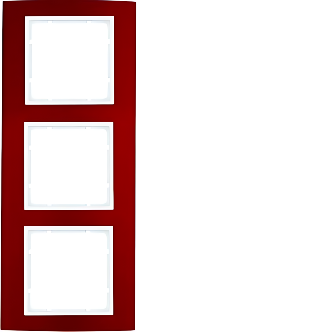 Berker 3fach Rahmen 10133022 Rahmen 3fach B.3 Alu, rot/polarweiß. Abdeckrahmen für senkrechte und waagerechte Montage. Für Verwendung von anthrazitfarbenen Zentralstücken. Unterputz-Installation, Flächen-/Designprogramm, 3-fach. Material Aluminium und Kunststoff, Thermoplast, bruchsicher, halogenfrei. Hersteller Berker Schalterprogramm EAN Nr. 4011334384793 Warengruppe Berker Serie B