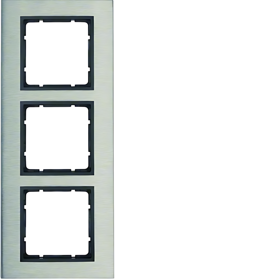 Berker 3fach Rahmen 10133606 Rahmen 3fach B.7 Edelstahl/anthrazit. Abdeckrahmen für senkrechte und waagrechte Montage für Verwendung von Zentralstücken anthrazit, BxH 95x232mm. Unterputz-Installation, Flächen-/Designprogramm, 3-fach. Material Edelstahl Rostfrei und Kunststoff, Thermoplast, bruchsicher, halogenfrei. Hersteller Berker Schalterprogramm EAN Nr. 4011334383192 Warengruppe Berker Serie B