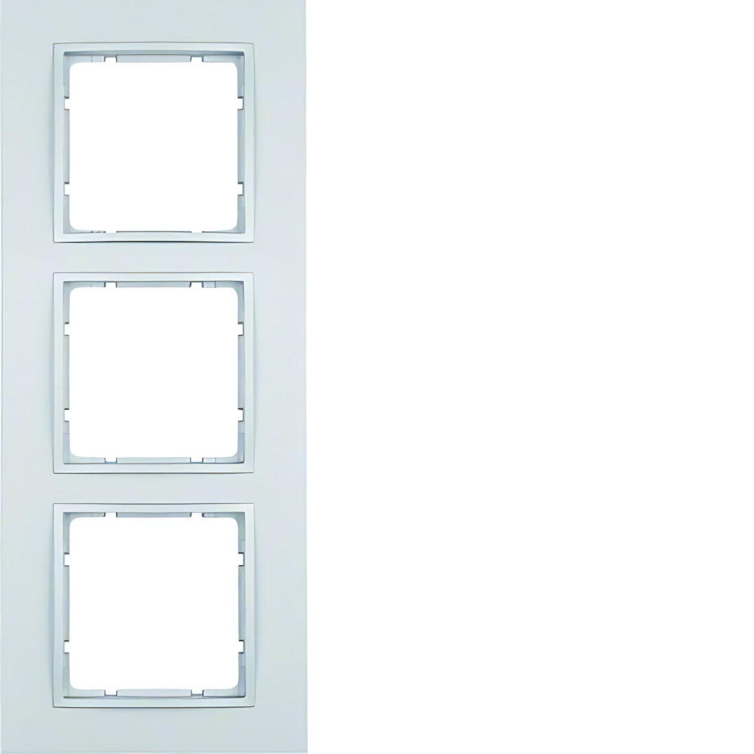 Berker 3fach Rahmen 10136424 Rahmen 3fach B.7 alu, matt. Abdeckrahmen für senkrechte und waagerechte Montage für Verwendung von alufarbenen Zentralstücken. Unterputz-Installation, Flächen-/Designprogramm, 3-fach. Material Kunststoff, Thermoplast, bruchsicher, halogenfrei. Hersteller Berker Schalterprogramm EAN Nr. 4011334376736 Warengruppe Berker Serie B