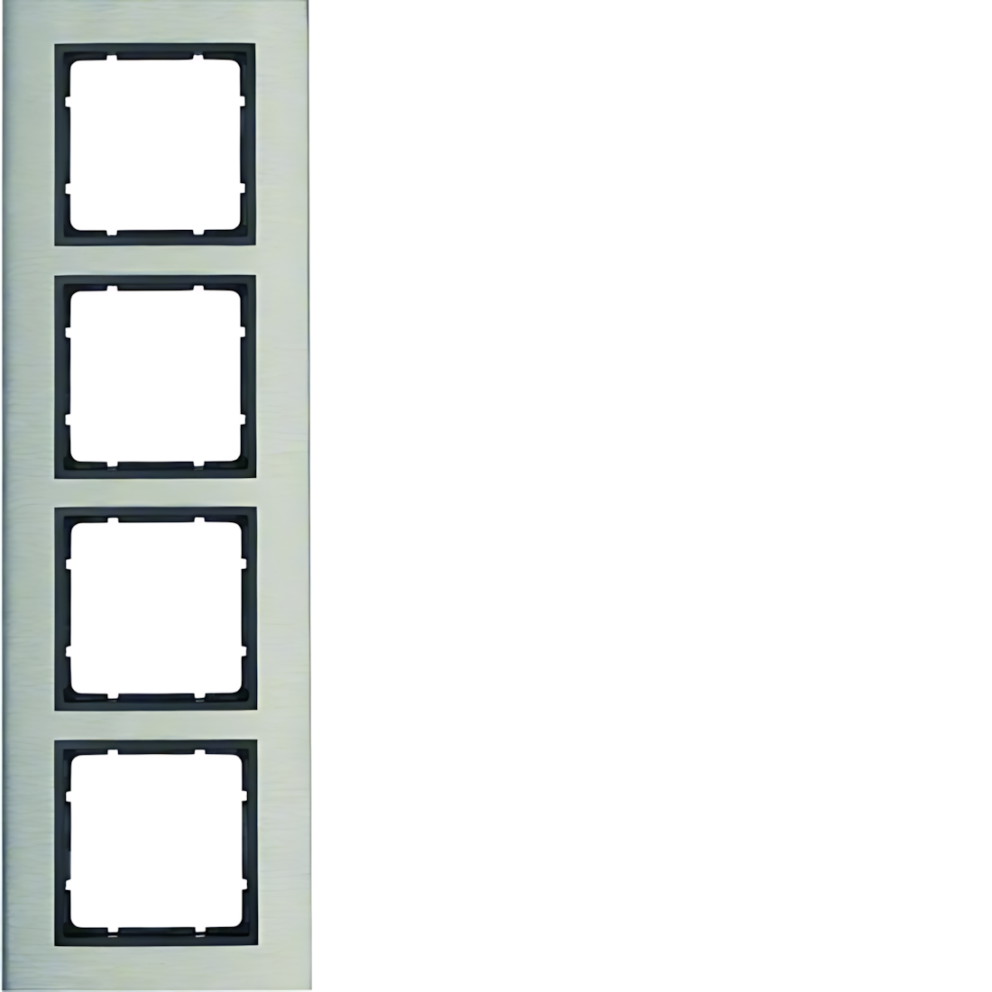 Berker 4fach Rahmen 10143606 Rahmen 4fach B.7 Edelstahl/anthrazit. Abdeckrahmen für senkrechte und waagrechte Montage für Verwendung von Zentralstücken anthrazit, BxH 95x303mm. Unterputz-Installation, Flächen-/Designprogramm, 4-fach. Material Edelstahl Rostfrei und Kunststoff, Thermoplast, bruchsicher, halogenfrei. Hersteller Berker Schalterprogramm EAN Nr. 4011334385011 Warengruppe Berker Serie B