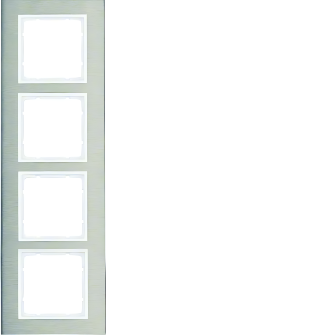 Berker 4fach Rahmen 10143609 Rahmen 4fach B.7 Edelstahl/polarweiß. Abdeckrahmen für senkrechte und waagrechte Montage für Verwendung von polarweißen Zentralstücken, BxH 95x303mm. Unterputz-Installation, Flächen-/Designprogramm, 4-fach. Material Edelstahl Rostfrei und Kunststoff, Thermoplast, bruchsicher, halogenfrei. Hersteller Berker Schalterprogramm EAN Nr. 4011334385042 Warengruppe Berker Serie B