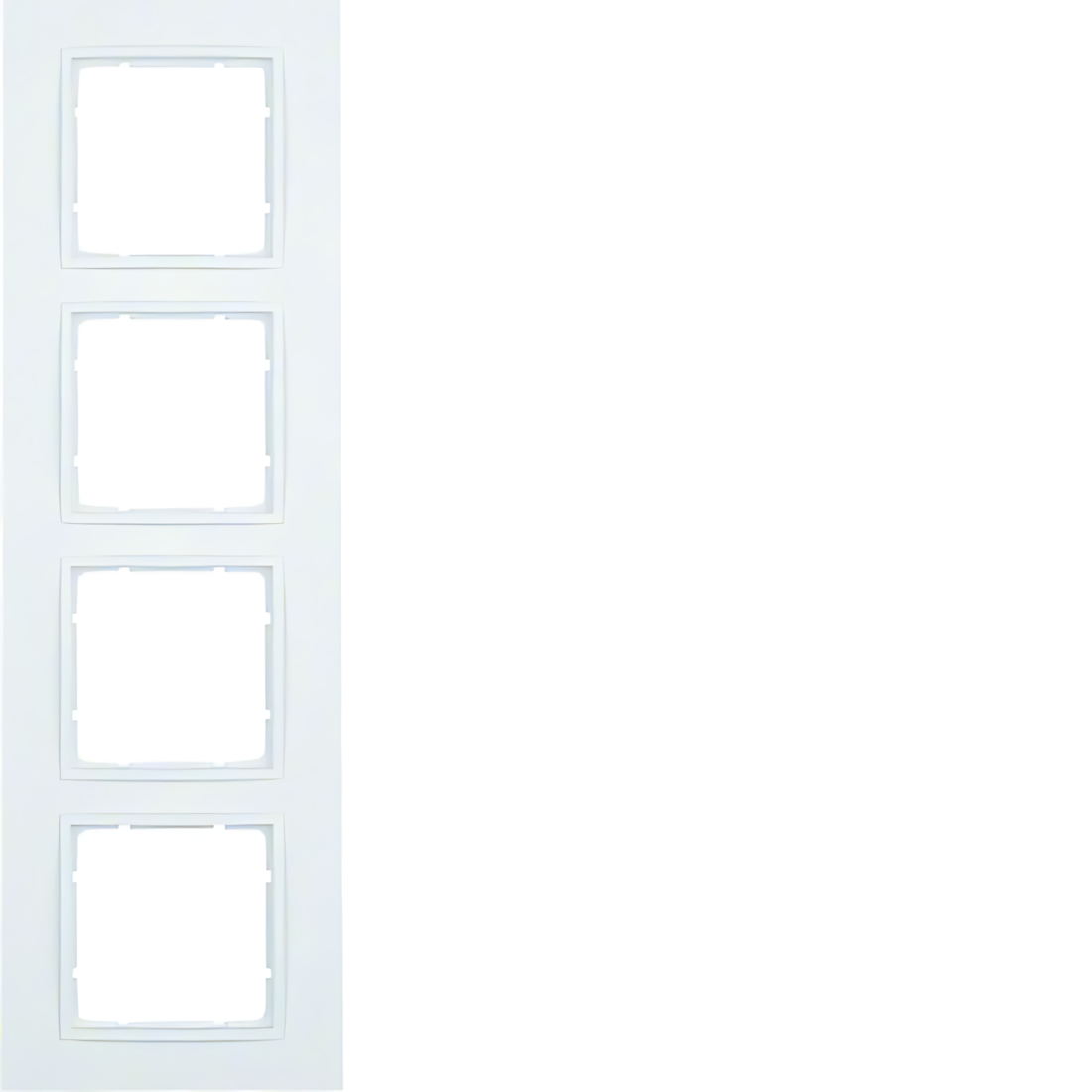 Berker 4fach Rahmen 10146919 Rahmen 4fach B.7 polarweiß, matt. Abdeckrahmen für senkrechte und waagerechte Montage für Verwendung von polarweißen Zentralstücken, BxH 95x303mm. Unterputz-Installation, Flächen-/Designprogramm, 4-fach. Material Kunststoff, Thermoplast, bruchsicher, halogenfrei. Hersteller Berker Schalterprogramm EAN Nr. 4011334376644 Warengruppe Berker Serie B