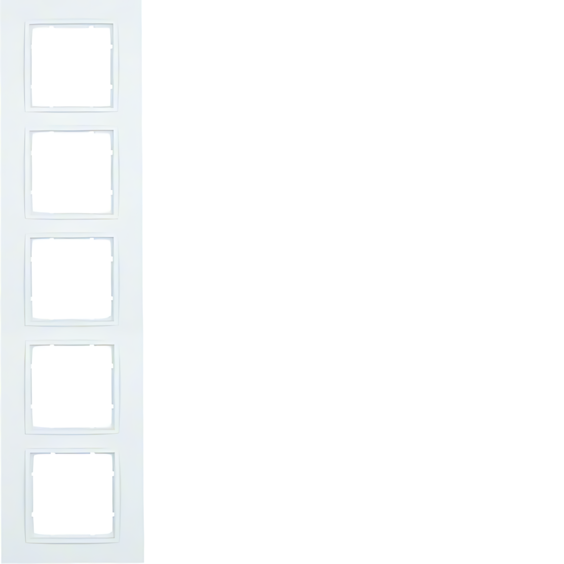 Berker 5fach Rahmen 10156919 Rahmen 5fach B.7 polarweiß, matt. Abdeckrahmen für senkrechte und waagerechte Montage für Verwendung von polarweißen Zentralstücken, BxH 95x384mm. Unterputz-Installation, Flächen-/Designprogramm, 5-fach. Material Kunststoff, Thermoplast, bruchsicher, halogenfrei. Hersteller Berker Schalterprogramm EAN Nr. 4011334376651 Warengruppe Berker Serie B