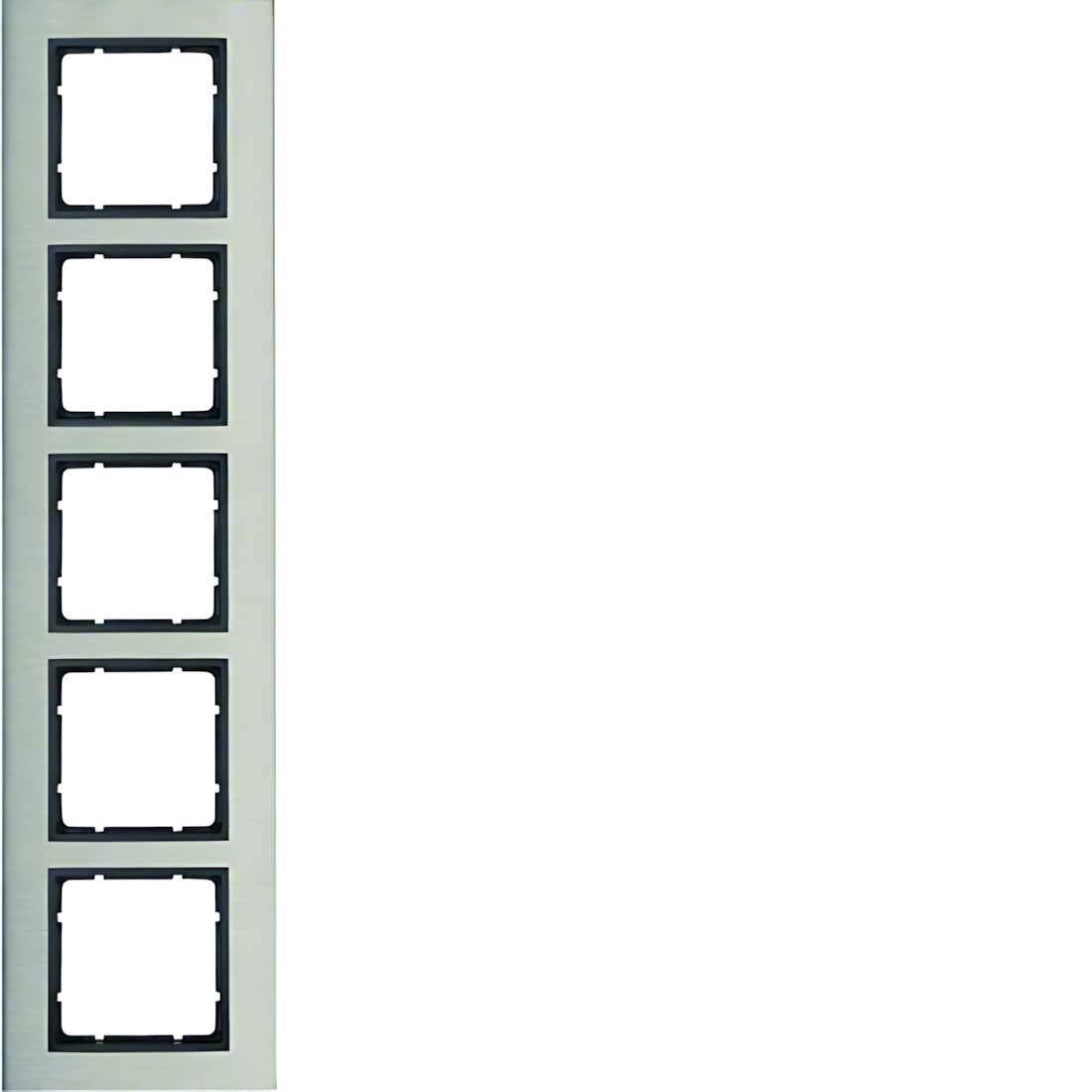Berker 5fach Rahmen 10253606 Rahmen 5fach waagerecht B.7 Edelstahl/anthrazit. Abdeckrahmen für senkrechte und waagerechte Montage für Verwendung von Zentralstücken anthrazit, BxH 95x303mm. Unterputz-Installation, Flächen-/Designprogramm. Hersteller Berker Schalterprogramm EAN Nr. 4011334383253 Warengruppe Berker Serie B