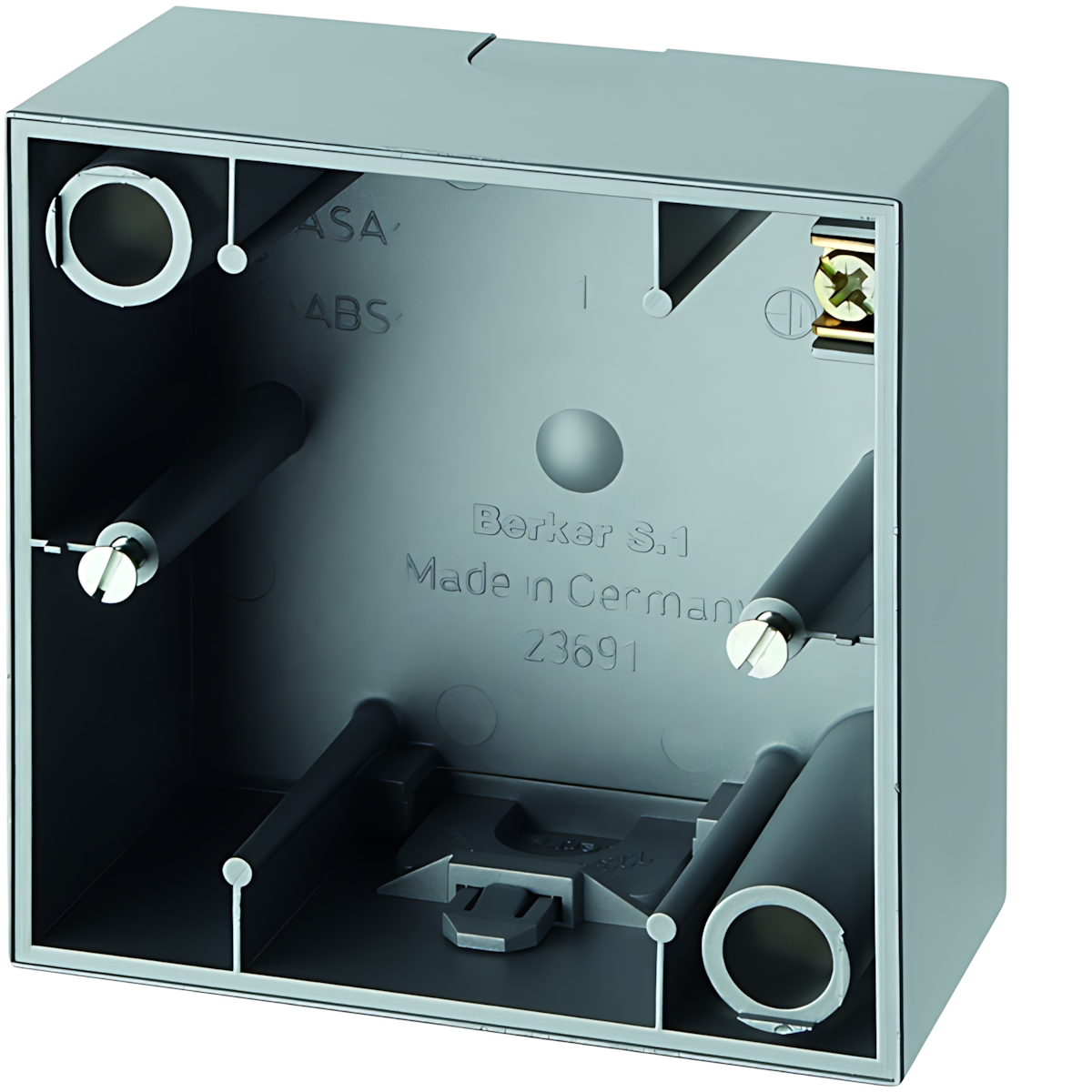 Berker Aufputzgehäuse 10419939 Aufputz-Gehäuse 1fach Q.3 alu samt lackiert. Aufputz-Rahmen 1-fach für senkrechte und waagerechte Montage, mit Leitungs- und Kanaleinführung, Einführung oben und unten möglich, Flächen-/Designprogramm. Mit dem Aufputz-Gehäuse können Unterputz-Apparate zur Aufputz-Installation verwendet werden. Material Kunststoff, Duroplast, halogenfrei. Hersteller Berker Schalterprogramm EAN Nr. 4011334360469 Warengruppe Berker Serie Q