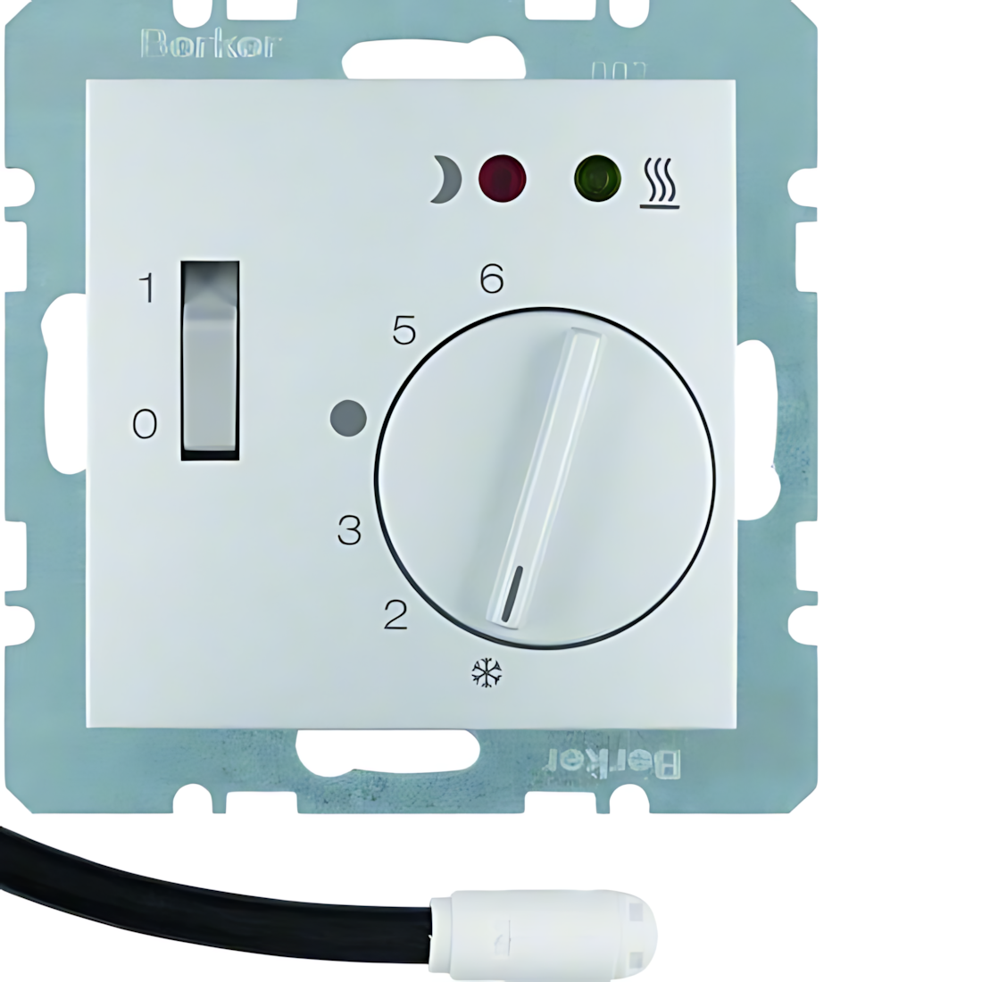 Berker Fußbodentemperaturfühler 20341404 Fußbodentemperaturregler mit Schließer, Z.-Stk., Wippschalter, B.7 alu, matt. Fußbodentemperaturregler mit Schließer, Zentralstück, Wippschalter, 2 LED und Fußbodentemperaturfühler, mit Aufdruck, Regulierknopf mit Temperaturbereichsbegrenzung, mit Ein-/Ausschalter und 2 LED, mit LED für Heizen und LED für Nachtabsenkung, mit separatem Anschluss für Nachtabsenkung, inklusive Fußbodentemperaturfühler, z.B. für Stellantriebe stromlos geschlossen, ohne Spreizkrallen, mit Steckklemmen, Neutralleiter erforderlich, Wird die eingestellte Temperatur unterschritten, schließt der Kontakt. Unterputz-Installation, Standardprogramm Material Kunststoff, halogenfrei. Hersteller Berker Schalterprogramm EAN Nr. 4011334310051 Warengruppe Berker Serie B