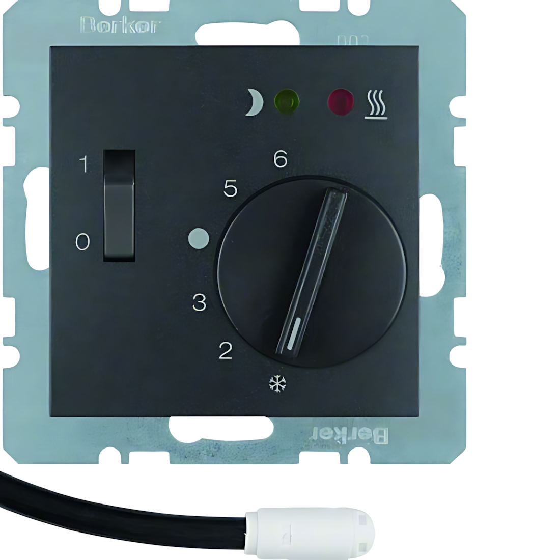 Berker Fußbodentemperaturfühler 20341606 Fußbodentemp.-Regler m. Schließer, Z.-Stk., Wippsch., B.3/B.7 anthrazit, matt. Fußbodentemperaturregler mit Schließer, Zentralstück, Wippschalter, 2 LED und Fußbodentemperaturfühler, mit Aufdruck, Regulierknopf mit Temperaturbereichsbegrenzung, mit Ein-/Ausschalter und 2 LED, mit LED für Heizen und LED für Nachtabsenkung, mit separatem Anschluss für Nachtabsenkung, inklusive Fußbodentemperaturfühler, z.B. für Stellantriebe stromlos geschlossen, ohne Spreizkrallen, mit Steckklemmen, Neutralleiter erforderlich, Wird die eingestellte Temperatur unterschritten, schließt der Kontakt. Unterputz-Installation, Flächen-/Designprogramm Material Kunststoff, Thermoplast, bruchsicher, halogenfrei. Hersteller Berker Schalterprogramm EAN Nr. 4011334310044 Warengruppe Berker Serie B