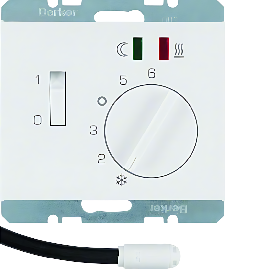 Berker Fußbodentemperaturfühler 20347109 Fußbodentemp.-Regler m. Schließer, Z.-Stk., Wippsch., K.1 polarweiß, glänzend. Fußbodentemperaturregler mit Schließer, Zentralstück, Wippschalter, 2 LED und Fußbodentemperaturfühler, mit Aufdruck, Regulierknopf mit Temperaturbereichsbegrenzung, mit Ein-/Ausschalter und 2 LED, mit LED für Heizen und LED für Nachtabsenkung, mit separatem Anschluss für Nachtabsenkung, inklusive Fußbodentemperaturfühler, z.B. für Stellantriebe stromlos geschlossen, ohne Spreizkrallen, mit Steckklemmen, Neutralleiter erforderlich, Wird die eingestellte Temperatur unterschritten, schließt der Kontakt. Unterputz-Installation, Flächen-/Designprogramm Material Kunststoff, Thermoplast, bruchsicher, halogenfrei. Hersteller Berker Schalterprogramm EAN Nr. 4011334310075 Warengruppe Berker Serie K