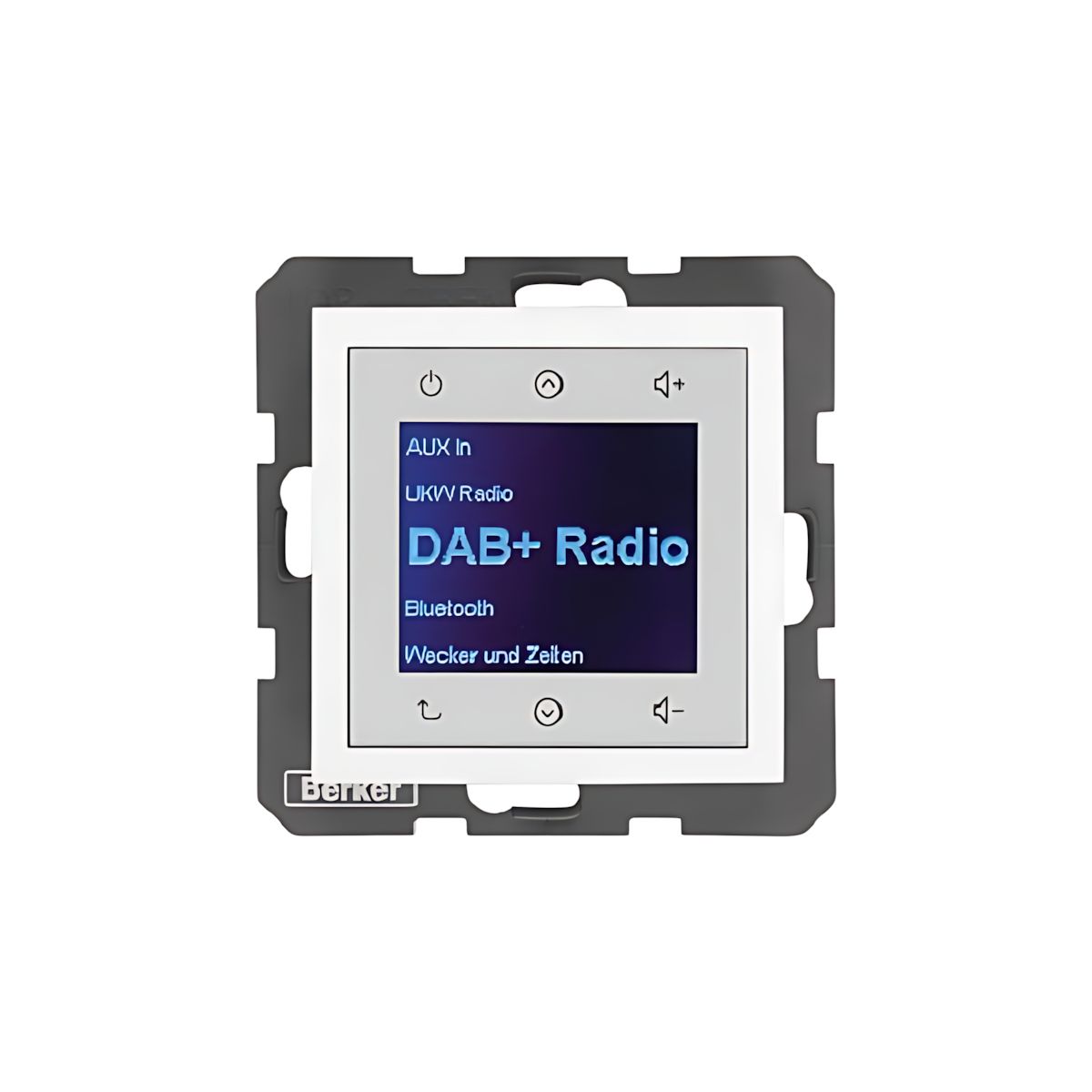 Berker Radio Touch 30848989 Radio DAB+, Bt., S.1/B.x pw., gl. Radio Touch UP DAB+, Bluetooth S.1/B.x polarweiß glänzend. Radio Touch DAB+/Bluetooth zum Empfang von digitalen DAB+- oder analogen UKW-Sendern mit RDS-Anzeige zur Montage in zwei Unterputz-Gerätedosen nach DIN 49073 oder Aufputz-Gehäuse. Radiomodul Anschluss: Betriebsspannung, Nebenstelleneingang für Ein-/Ausschaltung, 2x Lautsprecher für rechts/links, AUX IN für externe Audioquellen, Wurf-Antennenanschuss und Radio-Aufsatz Buchse für das Touch Display. Über die Bluetooth-Verbindung werden von max. 8 mobilen Endgeräten multimediale Inhalte über das Radio/den Lautsprecher wiedergegeben (Streaming). Radio Touch Funktionen: 6 Symbol-Tasten für Ein-/Ausschalten, Bedienungsebene zurückspringen, scrollen/Wert hoch/runter und Lautstärke +/-. Die Symbol-Tastfunktionen oder die Display-Bedienungsfunktionen ermöglichen den Abruf von Senderspeicher (8 Sendeplätze jeweils für UKW oder DAB+), Uhrzeit-/Datumsanzeige, Wecker Funktionen, Timer/Countdown, Sprache, Beleuchtung, AUX oder Sound. Dazu werden über die Tasten die Sendersuchläufe gestartet. Das Radio verfügt über einen speziellen Hotelmode, in dem die Bedienung des Gerätes eingeschränkt ist. Hinweis: Ein notwendige Lautsprecher, Gerätedosen oder AP-Gehäuse und der Design-Rahmen sind nicht enthalten. Ein zweiter Lautsprecher und eine Wurf-Antenne (Empfehlung l = 75 cm für FM, l = 40 cm für DAB+) zur Empfangsverbesserung kann optional angeschlossen werden. Hersteller Berker EAN Nr. 4011334529170 Warengruppe Berker Serie S