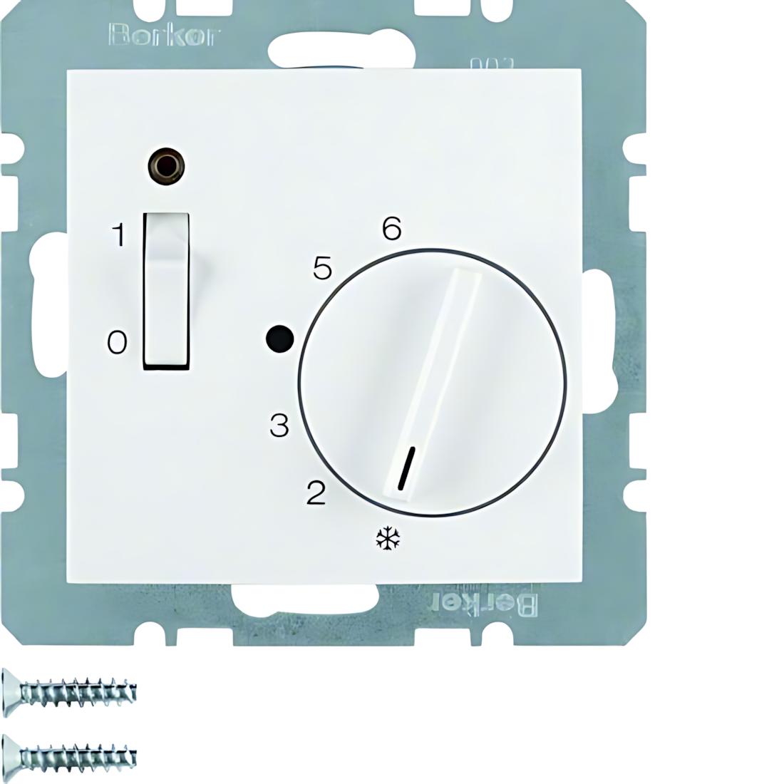 Berker Temperaturregler 20311909 Temp.-Regler 24 V m. Öffner, Z.-Stk., Wippsch. u. LED S.1/B.3/B.7 polarweiß,matt. Raumtemperaturregler 24 V mit Öffner, Zentralstück, Wippschalter und LED, mit Aufdruck, Regulierknopf mit Temperaturbereichsbegrenzung, mit Ein-/Ausschalter und Kontroll-LED für Ein, mit Kontroll-LED für Ein, mit thermischer Rückführung, mit separatem Anschluss für Nachtabsenkung, z.B. für Stellantriebe stromlos geschlossen, ohne Spreizkrallen, mit Steckklemmen, Wird die eingestellte Temperatur erreicht, öffnet der Kontakt. Unterputz-Installation, Standard-/Flächen-/Designprogramm. Material Kunststoff, Thermoplast, bruchsicher, halogenfrei. Hersteller Berker Schalterprogramm EAN Nr. 4011334309833 Warengruppe Berker Serie B