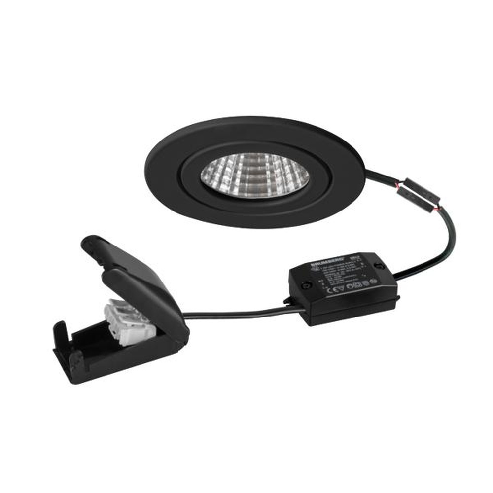 Brumberg LED Einbaudownlight 38475083 LED-Einbaudownlight 230 V AC, 50 Hz, 6 W, 38 Grad, 3.000 K, rund, starr, schwarz ma LED-Einbaudownlightset, V4A, IP54, schaltbar, mit Anschlussbox, schwarz matt, rund. Ausgeführt in kompakter Bauform für werkzeuglose Schnellmontage zum Deckeneinbau. Set inkl. Konverter für 230 V-Netzspannung, schaltbar, Maße Konverter: L 68xB 35xH 21 mm Montageart: Einbaumontage, Montageort: Deckenmontage, Material: Edelstahl V4A/Aluminium/Glas/Kunststoff, Schutzart raumseitig: nach DIN EN 60529: IP54, Schutzklasse: (EN 61140) II, Spannung: 230V AC 50Hz, Leistung: 6 W, Anzahl der Leuchtmittel/Fassungen: 1 Stück, Lichtstrom: 680 lm, Farbtemperatur: 3.000 K, Abstrahlwinkel: 38 Grad, Verstellbarkeit: nicht verstellbar, Mit Betriebsgerät: Ja, Dimmbar: Nein, Art der Dimmung: schaltbar. Hersteller Brumberg Nr. 38475083 EAN Nr. 4251433997016 Warengruppe Brumberg Einbauleuchten