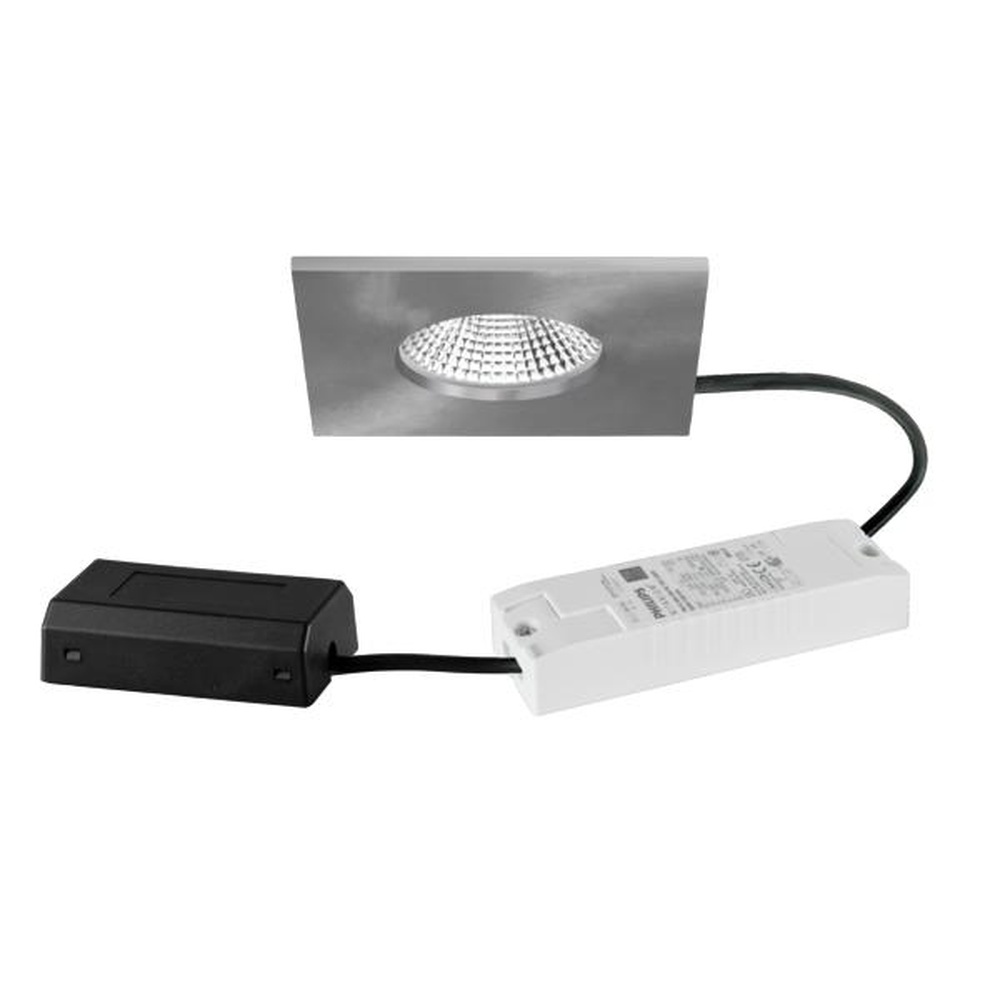 Brumberg LED Einbaudownlight 41481153 LED-Einbaudownlight 230 V AC, 50 Hz, 7 W, 36 Grad, 3.000 K, quadratisch, starr, nic LED-Einbaudownlightset, IP65, DALI dimmbar, mit Anschlussbox, nickel matt, quadratisch. Ausgeführt in kompakter Bauform für werkzeuglose Schnellmontage zum Deckeneinbau. Set inkl. Konverter für 230 V-Netzspannung, DALI-2 dimmbar, Maße Konverter: L 130xB 42xH 22 mm Montageart: Einbaumontage, Montageort: Deckenmontage, Material: Aluminium/Silikonkautschuk/PMMA, Schutzart raumseitig: nach DIN EN 60529: IP65, Schutzklasse: (EN 61140) II, Spannung: 230V AC 50Hz, Leistung: 7 W, Anzahl der Leuchtmittel/Fassungen: 1 Stück, Lichtstrom: 620 lm, Farbtemperatur: 3.000 K, Abstrahlwinkel: 36 Grad, Verstellbarkeit: nicht verstellbar, Mit Betriebsgerät: Ja, Dimmbar: Ja, Art der Dimmung: DALI-2. Hersteller Brumberg Nr. 41481153 EAN Nr. 4251433948599 Warengruppe Brumberg Einbauleuchten