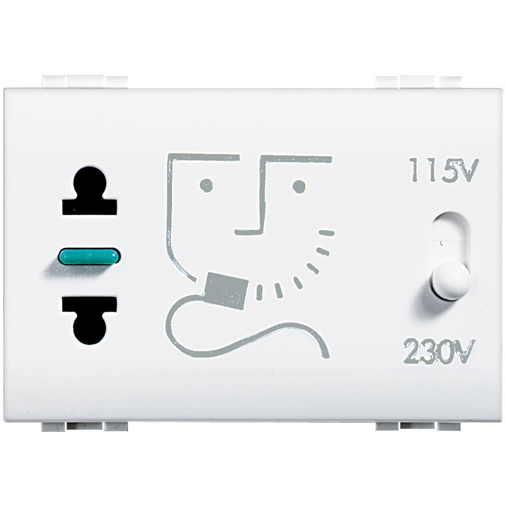 Bticino Steckdose N4177 Steckdose für Rasierapparat mit Trenntrafo – Eingang 230 V a.c. 50 60 Hz – Ausgang 115 230 V a.c. 20 VA – 3 modulig, Farbe weiß Hersteller Bticino Schalterprogramm Nr. N4177 EAN Nr. 8012199530123 Warengruppe Bticino Living Light Einsätze