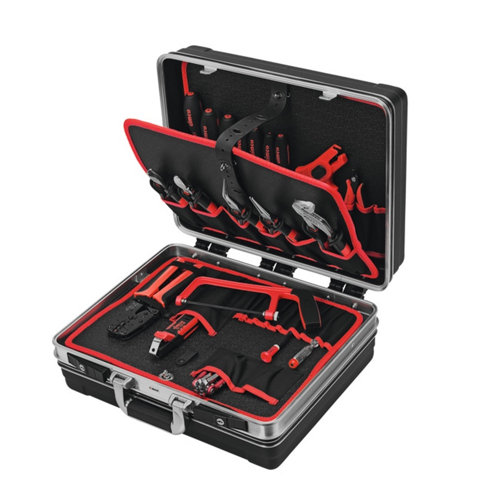 Cimco Werkzeugkoffer 170331 Bestückter Werkzeugkoffer Klassik Elektro Meisterkoffer Klassik Elektro Profi-Hartschalenkoffer aus schlagfestem 3 mm-starkem ABS-Kunststoff mit Aluminiumrahmen, 3 Werkzeugtafeln mit vielen Einsteckfächern, separate Dokumentenaufbewahrung, Bodenschale mit individuell verstellbaren Facheinteilern für Kleinteile, Messgeräte, Werkzeug etc., 2 abschließbare Schlösser komplett mit 23 Werkzeugen, Abisolierzange Nr. 10 9686, Elektronik-Seitenschneider Nr. 10 1040, Telefonzange, gerade Nr. 10 9216, Wasserpumpenzange Nr. 10 9224, Telefonzange, gebogen Nr. 10 9238, Kombinationszange Nr. 10 9336, Kraft-Seitenschneider Nr. 10 9528, Stechahle Nr. 11 0482, Stiftschlüssel-Satz Nr. 11 0590, Spannungsprüfer Nr. 11 1280, Präzisions-Schraubendreher Nr. 11 1864, Schlitz-Schraubendreher mit 1000 V-Schutzisolation Nr. 11 7702, dito Nr. 11 7704, dito Nr. 11 7705, dito Nr. 11 7706, Kreuzschlitz-Schraubendreher mit 1000 V-Schutzisolation Nr. 11 7731, dito Nr. 11 7732, dito Nr. 11 7741, dito Nr. 11 7742, Kabelmesser, Kunststoff Nr. 12 0050, Universalschere Nr. 12 0122, Taschensäge Nr. 12 0490, Kabelmesser Nr. 12 1010, Koffer, leer Nr. 17 0075 EAN Nr. 4021103703311 Warengruppe Cimco Werkzeugkoffer