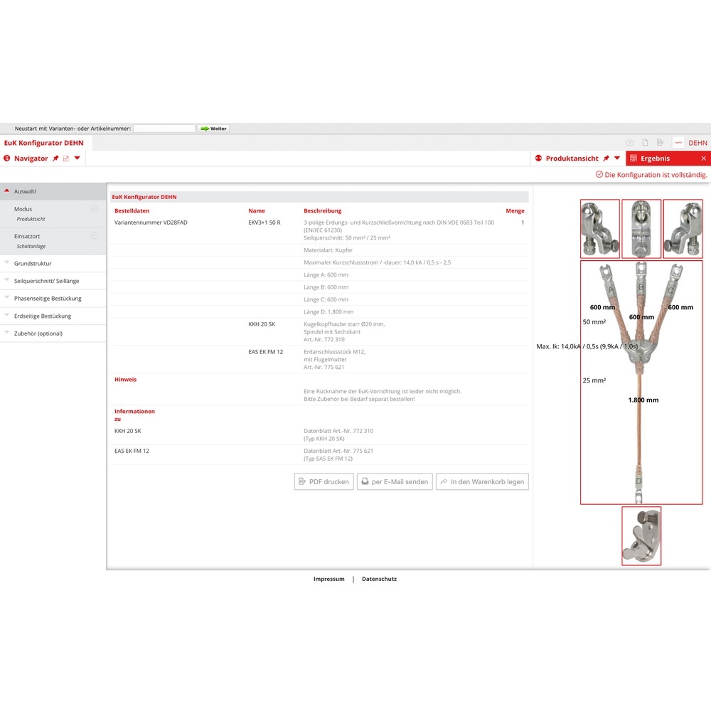 Dehn + Söhne Kurzschließvorrichtung VD28FAD Typ EKV3+1 50 R VD28FAD Erdungs- und Kurzschließseil 3-polig 50mm² mit aufgepressten Kabelschuhen Dreipolige Erdungs- und Kurzschließvorrichtung nach DIN VDE 0683-100 (EN/IEC 61230), Seilquerschnitt 50 mm²/25 mm², Maximaler Kurzschlussstrom/-dauer 14,0 kA/0,5 s-2,5 Länge A=B=C= 600 mm, Länge D = 1800 mm phasenseitig bestückt mit 3x Kugelkopfhaube starr Ø20 mm, SK mit Art.-Nr. 772 310 und erdseitig bestückt mit 1x Erdanschlussstück M12, mit Flügelmutter und Art.-Nr. 775 621. Typ EKV3+150RVD28FAD EAN Nr. 4013364165434 Warengruppe Dehn + Söhne Sicherheitstechnik