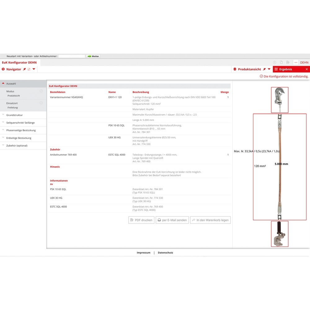 Dehn + Söhne Kurzschließvorrichtung VG4GXHQ Typ EKV1+1 120 VG4GXHQ Erdungs- und Kurzschließseil 1-polig 120mm² mit aufgepressten Kabelschuhen Einpolige Erdungs- und Kurzschließvorrichtung nach DIN VDE 0683-100 (EN/IEC 61230), Seilquerschnitt 120 mm², Maximaler Kurzschlussstrom/-dauer 33,5 kA/0,5 s-2,5 Länge A=5000 mm phasenseitig bestückt mit 1x Phasenschraubklemme Klemmbereich Ø10...65 mm mit Art.-Nr. 784 301 und erdseitig bestückt mit 1x Universalklemme Ø25/30 mm, mit Handgriff und Art.-Nr. 774 330. Typ EKV1+1120VG4GXHQ EAN Nr. 4013364165618 Warengruppe Dehn + Söhne Sicherheitstechnik