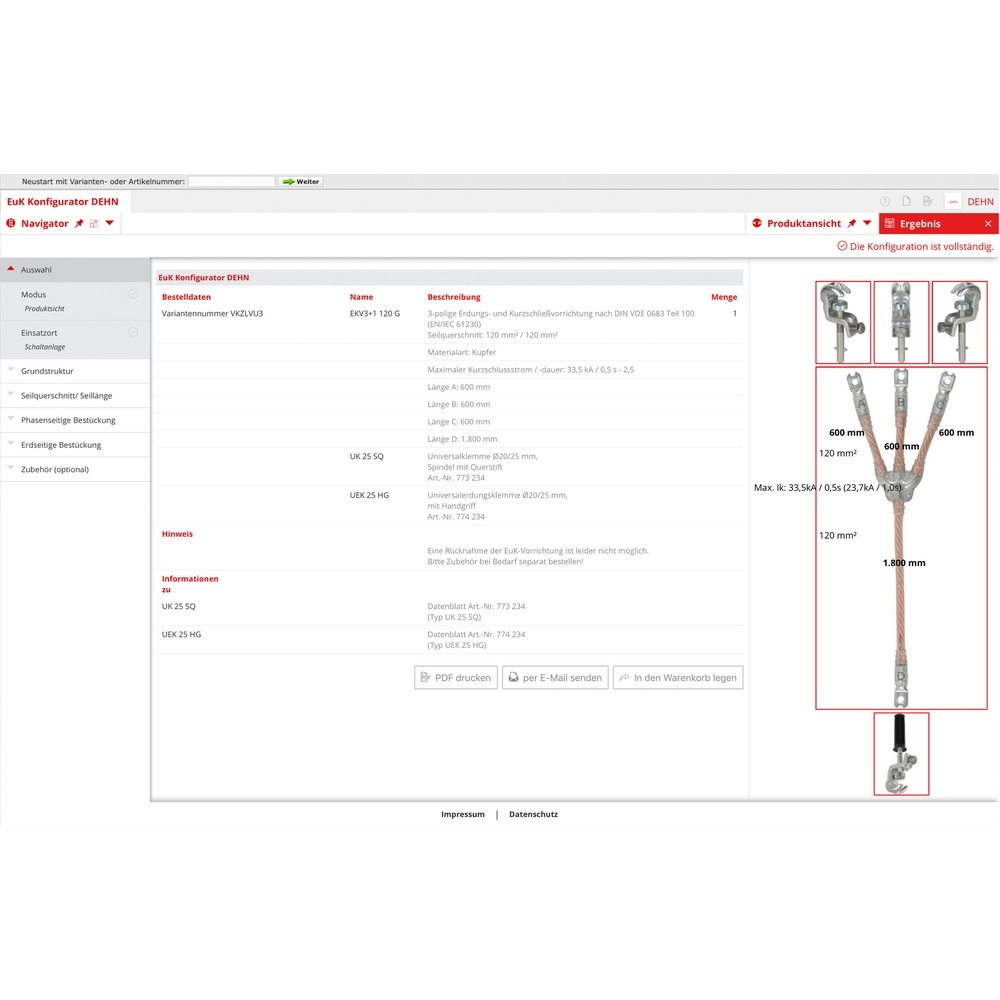 Dehn + Söhne Kurzschließvorrichtung VMLM2BZ Typ EKV3+1 70 G VMLM2BZ Erdungs- und Kurzschließseil 3-polig 70mm² mit aufgepressten Kabelschuhen Dreipolige Erdungs- und Kurzschließvorrichtung nach DIN VDE 0683-100 (EN/IEC 61230), Seilquerschnitt 70 mm²/70 mm², Maximaler Kurzschlussstrom/-dauer 19,5 kA/0,5 s-2,5 Länge A=B=C= 600 mm, Länge D = 1800 mm phasenseitig bestückt mit 3x Universalklemme Ø20/25 mm, SQ mit Art.-Nr. 773 234 und erdseitig bestückt mit 1x Universalerdungsklemme Ø20/25 mm, mit Handgriff und Art.-Nr. 774 234. Typ EKV3+170GVMLM2BZ EAN Nr. 4013364165489 Warengruppe Dehn + Söhne Sicherheitstechnik