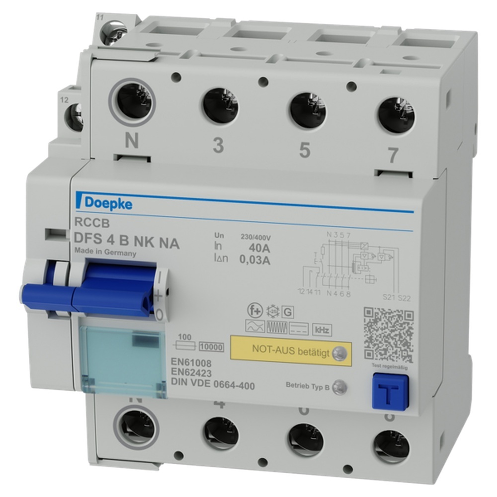 Deopke FI Schutzschalter 09134862 Typ DFS4 040-4/0,03-B NK NA FI-Schutzschalter 4p, 40 A, 0.03 A, Typ B NK, mit NOT-AUS-Funktion, N-li Fehlerstromschutzschalter (RCCB) schalten die Stromversorgung ab, wenn gefährlich hohe Fehlerströme auftreten. Sie schützen so Personen, Tiere und Anlagen. DFS 4 sind zwei- oder vierpolige Fehlerstromschutzschalter für ein- oder dreiphasige Netze. In Standardausführung sind die kompakten Geräte vier Teilungseinheiten schmal. Sie sind mit vielen verschiedenen Fehlerstromtypen und Ausführungen bei Bemessungsströmen bis zu 125 A erhältlich. Die großen Doppelstockklemmen können auch große Leiterquerschnitte aufnehmen. Die Ausgelöststellung des Multifunktionsschaltknebel erleichtert die Fehlersuche. Die kostenlose Etikettensoftware hilft bei der Beschriftung. Schalter des Typs B sind allstromsensitiv bei Frequenzen von 0 Hz (glatten Gleichfehlerströmen) bis 150 kHz. Sie sind erhöht stoßstrom- und gewitterfest. Die allstromsensitiven Fehlerstromschutzschalter der Baureihe NK bieten den klassischen Brandschutz von 300 mA bei Frequenzen von 0 bis 150 kHz. Sie sind für feuergefährdete Betriebsstätten optimiert. An Fehlerstromschutzschalter in NA-Ausführung (NA für NOT-AUS) können z. B. Taster zur Abschaltung in Notsituationen angeschlossen werden. Eine integrierte LED zeigt die Notauslösung durch Taster oder Drahtbruch an. Der Fehlerstromschutzschalter lässt sich erst nach Behebung wieder einschalten. Mehrere RCCB können parallel geschaltet werden. Eigenschaften: allstromsensitiv für Fehlerströme mit Frequenzen und Mischfrequenzen von 0 Hz (glatter Gleichstrom) bis 150 kHz, netzspannungsunabhängige Auslösung bei Fehlerströmen des Typs A, spannungsabhängige Erfassung von glattem Gleichfehlerstrom und Wechselfehlerströmen mit Frequenzen ungleich 50/60 Hz, volle Funktionstüchtigkeit mit Netzspannungen ab mindestens 50 V AC an zwei beliebigen aktiven Leitern, mit NOT-AUS-Funktion zur Auslösung bzw. Abschaltung mittels Betätigungselementen, Überwachung der NOT-AUS-Funktion auf Drahtbruch und Anzeige durch eine LED, bei einem Spannungsausfall führt die NOT-AUS-Funktion zu keiner Auslösung, geringe Baugröße für alle Bemessungsströme, hohe Kurzschlussfestigkeit, beidseitige Doppelstockklemmen für großen Leiterquerschnitt und Schienenanschluss, Schaltstellungsanzeige, Sichtfenster für Beschriftungsetiketten, Multifunktionsschaltknebel mit drei Positionen: ein , aus , ausgelöst , Neutralleiterposition links, Montageart: Schnellbefestigung auf Tragschiene, Einbaulage beliebig, Einspeisung von oben, Einsatzgebiete: Gewerbliche und industrielle Installationen mit TN-S-, TT- und TN-C-S-Systemen, in denen Betriebsmittel der Leistungselektronik ohne galvanische Netztrennung zur Anwendung kommen, wie z. B. Frequenzumrichter, Schaltnetzteile, Hochfrequenzstromrichter. Photovoltaik- und USV-Anlagen mit trafolosen Wechselrichtern, Feuergefährdete Betriebsstätten, Hinweise: geeignet für den Einsatz in 50-Hz-Wechselstromnetzen, RCCB für andere Frequenzen auf Anfrage, Nicht für den Einsatz in Gleichstromnetzen sowie auf der Ausgangsseite von gesteuerten elektrischen Betriebsmitteln wie z. B. Frequenzumrichtern bestimmt. Hersteller Deopke Nr. 09134862 EAN Nr. 4014712224209 Warengruppe Doepke FI Schutzschalter