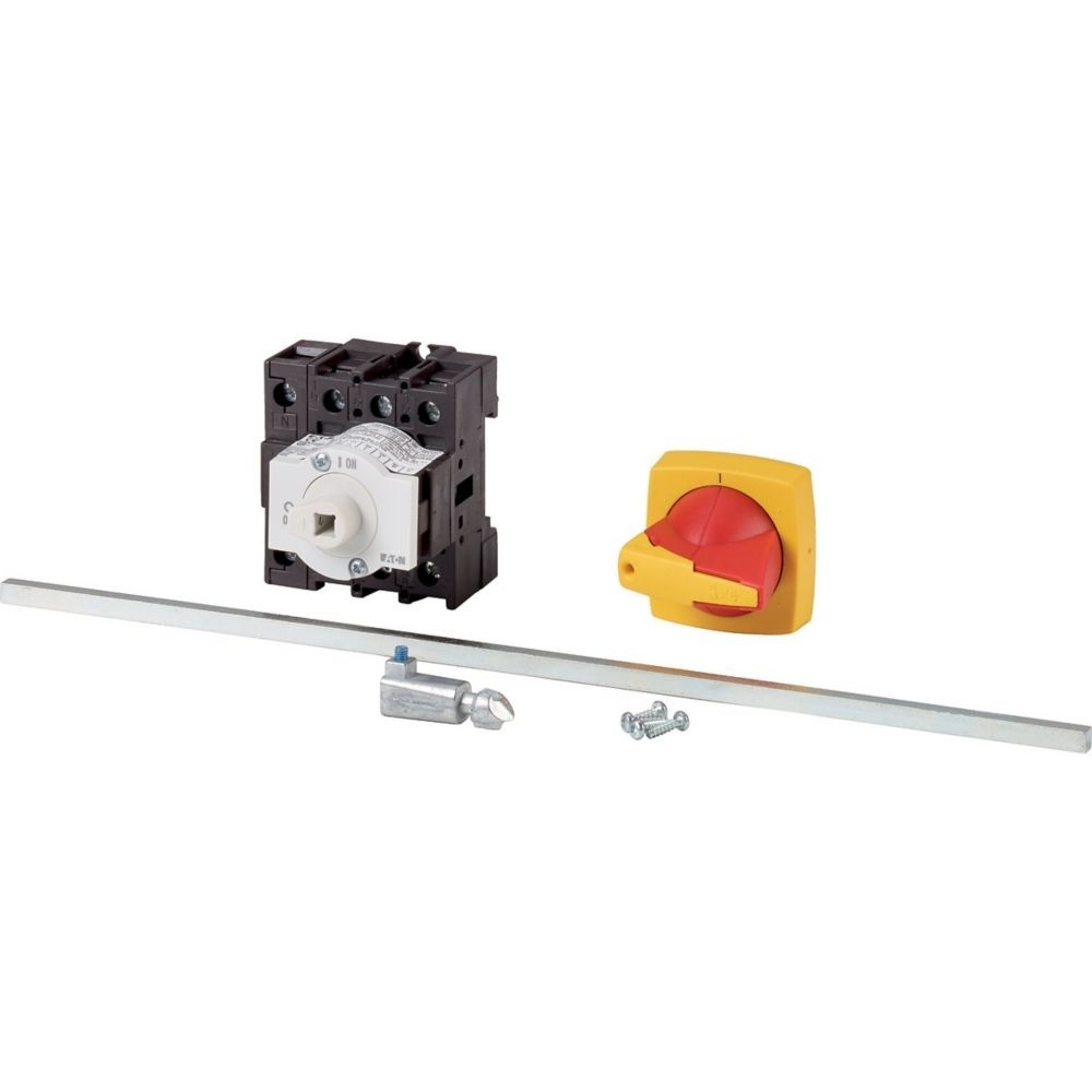 Eaton Hauptschalter 172778 Typ P1-32/M4/K1-PR/N Hauptschalter, 3-polig + N, 32 A, NOT-AUS-Funktion, abschließbar in 0-Stellung, Zwischenbau, mit 400 mm Metallachse Hauptschalter/Lasttrennschalter Ein-Aus nach IEC/EN 60947-3, 690V/32A, Schutzart Front IP65, Griff rot, abschliessbar mit 3 Vorhängeschlössern, Die Lasttrennschalter P1 sind sehr kompakt und robust gebaut. Der Handantrieb wirkt in direkter Verbindung auf die Kontakte. Die Kontakte werden beim Ausschalten zwangsläufig geöffnet. Mit Metallachse. Bauformen allgemein Isolierstoff-Aufbaugehäuse, Einbau, Zentraleinbau, Zwischenbau, IVS-Verteilereinbau, Alte Herstellerbezeichnung Klöckner Möller Herstellertyp 172778 EAN Nr. 4015081693641 Warengruppe Eaton Hauptschalter