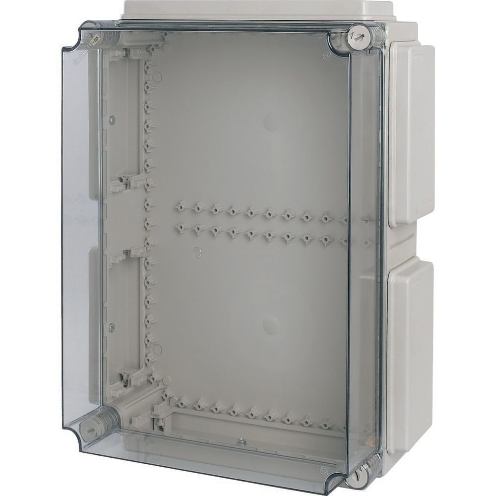 Eaton Isolierstoffgehäuse 264024 Typ CI45-200-NA Isolierstoffgehäuse, oben+unten offen, HxBxT=546x421x225mm, NA-Ausführung Verteiler-Leergehäuse, UL approbiert, Material Polycarbonat, schlagfest, Schutzart IP65, patentierter Deckelverschluss mit integriertem Überdruckausgleich, an alle 4 Seitenwänden mit abnehmbaren glatten Flanschen bestücktplombierbare Deckelverschlüsse, RAL 7032, kieselgrau (Unterkasten), durchsichtig, farblos (Deckel), Einbautiefe bei Montageplatte=200mm, Ausführung Deckel durchsichtig, Ausführung Unterteil rundum UL Flansche, Alte Herstellerbezeichnung Klöckner Möller Herstellertyp 264024 EAN Nr. 4015082640248 Warengruppe Eaton Isolierstoffgehäuse