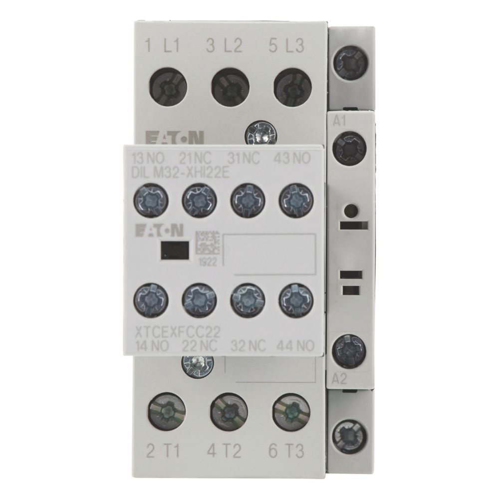 Eaton Leistungsschütz 106371 Typ DILM17-22(RDC24) Leistungsschütz, 3-polig + 2 Schließer + 2 Öffner, 7,5 kW/400 V/AC3, DC-betätigt Leistungsschütz mit doppelter Rahmenklemme zum zuverlässigen Verdrahten unterschiedlicher Kabelquerschnitte. Frontseitige Anschlüsse ermöglicht einfaches Verdrahten. Bereichsspulen mit integrierter Schutzbeschaltung und minimierter Verlustleistung. Gleiche Abmessungen für AC- und DC betätigte Schütze ermöglicht die Verwendung des selben Zubehörs. Lieferbares Zubehör Hilfsschalterbausteine aufsteckbar und Seitenanbau, mechanische Verriegelung, Elektronischer Zeitbaustein, Motorschutzrelais, Sternpunktbrücke, Parallelverbinder, IP2X Schutzabdeckung, Alte Herstellerbezeichnung Klöckner Möller Herstellertyp 106371 EAN Nr. 4015081061419 Warengruppe Eaton Leistungsschütz