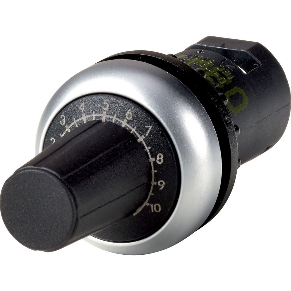 Eaton Potentiometer 288863 Typ M22-R*-*-RH Potentiometer, robuste Handhabung, Wert nach Angabe Individuell auf Kundenwunsch gestaltetes Potentiometer (Wiederstandswerte, individuelle Skalenbeschriftungen). Das Potentiometer im RMQ-Titan Design ergänzt die Produktreihe für präzise Einstellungen. Verfügbar mit schwarzen- und Titanfarbenen Frontring. Die Taste erfüllt die Schutzart IP66 und ist für den weltweiten Einsatz zugelassen., Alte Herstellerbezeichnung Klöckner Möller Herstellertyp 288863 Warengruppe Eaton Befehls/Meldegeräte