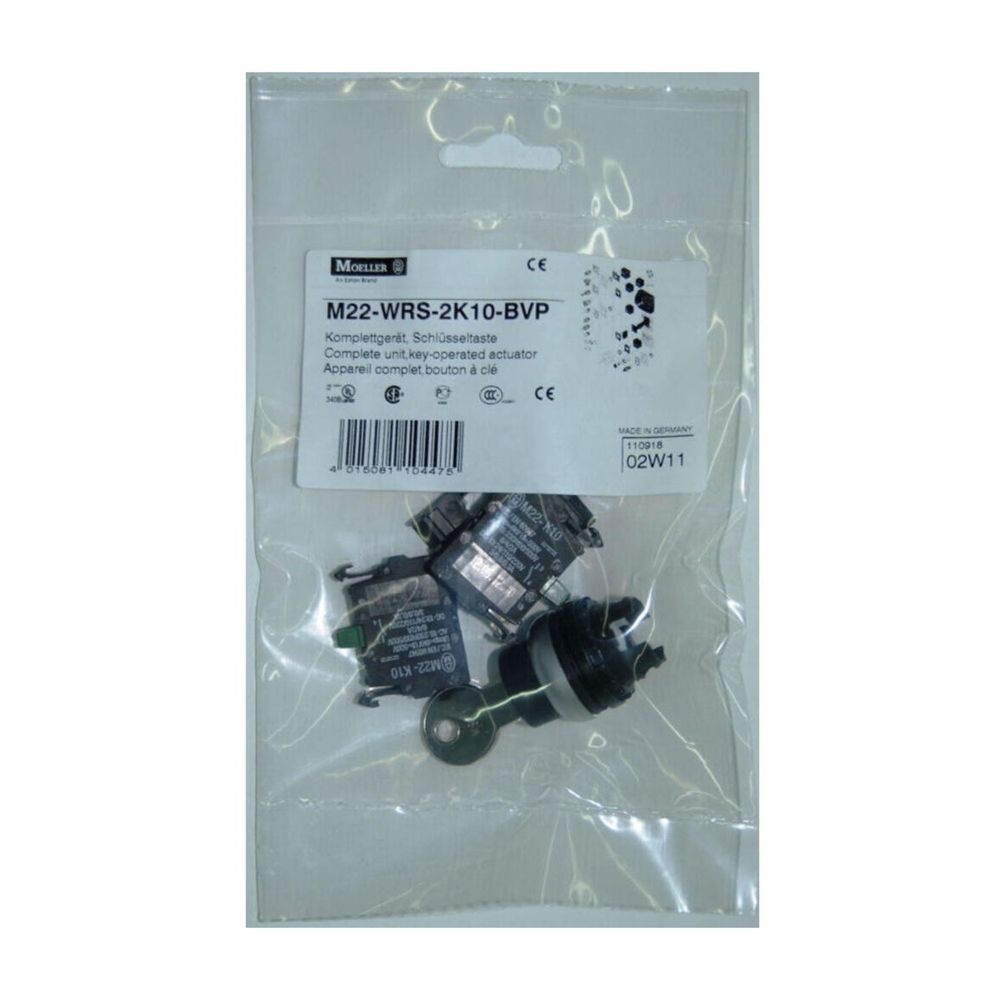 Eaton Schlüsselschalter 110918 Typ M22-WRS-2K10-BVP Schlüsselschalter 2 Schließer, Komplettgerät Bausatz bestehend aus Schlüsseltaster, 2 Stellungen, 1 Schlüssel MS1, rastend, Adapter für Fronteinbau, 2 Schließer, in Sichtverpackung zum Aufhängen, eine praktische Lösung kompett bestellbar unter einer Bestell-Nr., Alte Herstellerbezeichnung Klöckner Möller Herstellertyp 110918 EAN Nr. 4015081104475 Warengruppe Eaton Befehls/Meldegeräte