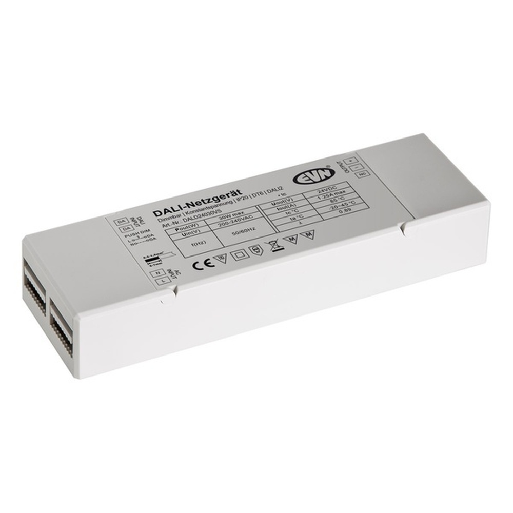 EVN Dimmer Empfänger DALD24030VS DALI Dimmer-Empfänger inkl. Netzgerät DALI-Dimmer-Empfänger mit integriertem Netzgerät für Unicolor-Leuchten mit automatischer DALI Adressen Einstellung. Ein Zusätzliches Betriebsgerät ist nicht erforderlich, da der Empfänger gleichzeitig als solches fungiert. Optional ist der Empfänger auch über Push-L dimmbar. Anschlüsse: 1x Eingang für DALI-Bus oder Push-L, 1x Eingang für 200-240V/AC und 1x Ausgang für 24V/DC. Die Steckklemmen sind für Kabel von 0,5mm²-1,5mm² geeignet. Technische Daten: ta: -20 GradC-45 GradC, tc: 85 GradC, Leistung: 0,1-30W, Powerfaktor: 0,90. Konform Standardprotokoll IEC 60929. Protokoll: DT6, DALI2. Hersteller EVN Nr. DALD24030VS EAN Nr. 4037293026468 Warengruppe EVN Zubehör