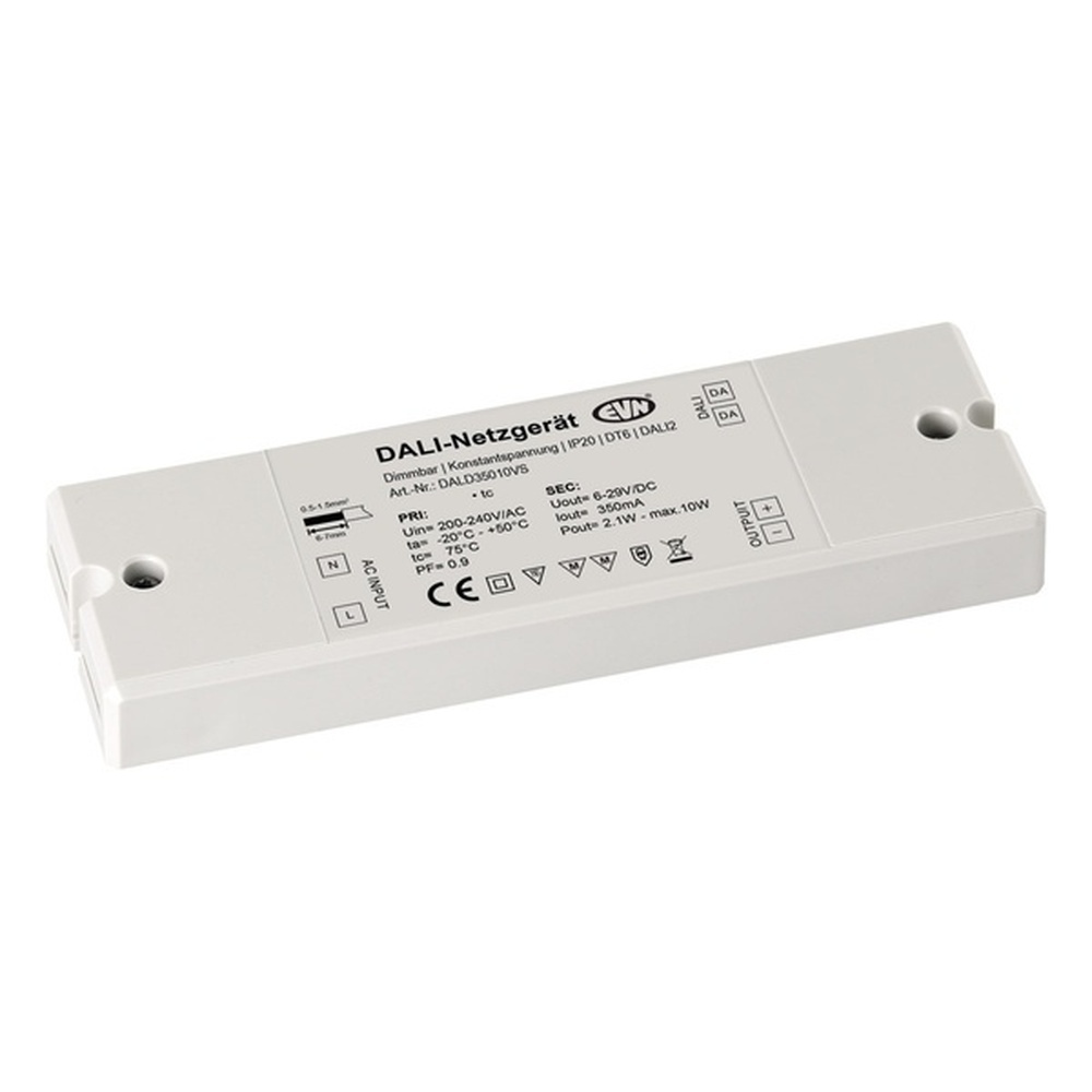 EVN Dimmer Empfänger DALD35010VS DALI Dimmer-Empfänger inkl. Netzgerät DALI-Dimmer-Empfänger mit integriertem Netzgerät für Unicolor-Leuchten mit automatischer DALI Adressen Einstellung. Ein Zusätzliches Betriebsgerät ist nicht erforderlich, da der Empfänger gleichzeitig als solches fungiert. Anschlüsse: 1x Eingang für DALI-Bus, 1x Eingang für 200-240V/AC und 1x Ausgang für 350mA. Die Schraubklemmen sind für Kabel von 0,5mm²-1,5mm² geeignet. Technische Daten: ta: -20 GradC-50 GradC, tc: 75 GradC, Leistung: 2,1-10W, Powerfaktor: 0,90. Protokoll: DT6, DALI2 Hersteller EVN Nr. DALD35010VS EAN Nr. 4037293031318 Warengruppe EVN Zubehör