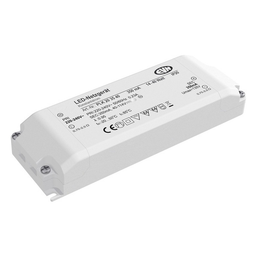 EVN Netzgerät PLK203540 NG 350mA-14-40W-IP20-Primär: 220-240V/AC Hersteller EVN Leuchten EAN Nr. 4037293017190 Warengruppe EVN Netzgeräte