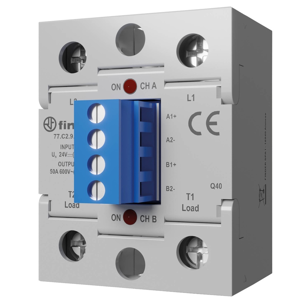 Finder Relais 77.C2.9.024.8671 Relais mit 2 SSR-Kontakten 50 A/24 bis 660 V AC, Einschaltstrom bis 500 A für 10 ms, Eingang 24 V DC, 2 DC-Eingänge Zweipoliges SSR-Relais, Hockey Puck-Bauform, Montage auf Schaltschrankblech oder auf Kühlkörper. Eingangsspannung 24 V DC, 2 Schließer für 50 A, Einschaltstrom bis 500 A für 10 ms, Schaltlastspannungsbereich 24 bis 660 V AC, Momentanwert-Schalter, 2 unabhängige Ausgänge, die von unterschiedlichen Eingängen angesteuert werden, Wärmeleistung bei In: 120 W, periodische Spitzensperrspannung: 1200 Vpk, Reststrom im AUS-Zustand bei Nennspannung: 5 mA. Spannungsfestigkeit Ein- zu Ausgang 4 kV. Umgebungstemperatur: -30 bis +80 °C, Relaisschutzart: IP 20. Ausführung: mit LED. Abmessungen: Länge= 58.4 mm, Breite= 45.7 mm, Höhe= 46 mm Hersteller Finder Nr. 77.C2.9.024.8671 EAN Nr. 8012823450612 Warengruppe Finder Relais