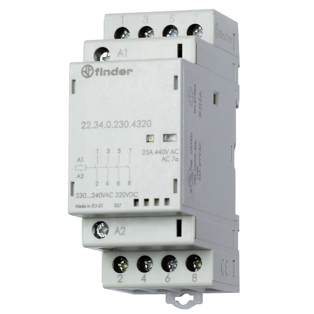 Finder Schütz 22.34.0.120.1620 Schütz für Reiheneinbau, 2 Öffner und 2 Schließer 25 A, Spule 120 V AC/DC, LED-Anzeige Installationsschütz für 35 mm-Schiene, 2 Schließer und 2 Öffner für 25 A/250 V AC, Kontaktmaterial AgNi, max. Schaltleistungen bei 230 V AC: AC1 6250 VA, AC15 1800 VA, 3-Phasen-Motorlast, AC3 (400-440 V AC) 4 kW, Energiesparlampen 100 W, LED (230 V AC) 100 W, NV-Halogenlampen oder LED mit EVG 100 W, NV-Halogenlampen oder LED mit KVG 300 W. Spule: 120 V AC/DC, Breite 35 mm, mit LED und mechanischer Schaltstellungsanzeige, Relaisschutzart: IP 20 Hersteller Finder Nr. 223401201620 EAN Nr. 8012823360089 Warengruppe Finder Installationsgeräte