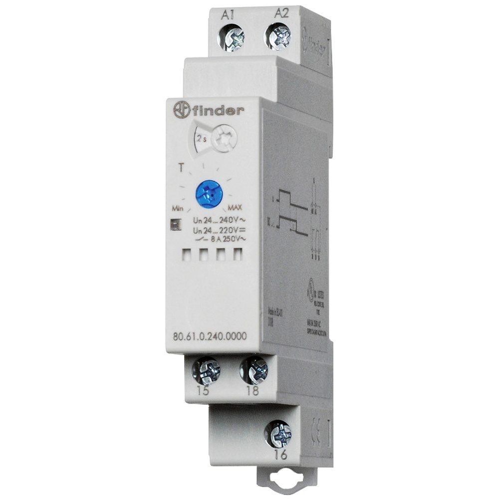 Finder Zeitrelais 80.61.0.240.0000 Zeitrelais, Rückfallverzögerung ohne Hilfsspannung bis 180 s, 1 Wechsler 8 A, für 24 bis 240 V AC/DC Zeitrelais, Rückfallverzögerung ohne Hilfsspannung, für DIN-Schiene, 17.5 mm breit, 1 Wechsler für 8 A/250 V AC, Kontaktmaterial AgNi, Zeitbereich: 0,05 s-180 Sek., Versorgungsspannung: 24..240 V AC/DC, Relaisschutzart: IP 20 Hersteller Finder Nr. 806102400000 EAN Nr. 8012823290645 Warengruppe Finder Zeitrelais
