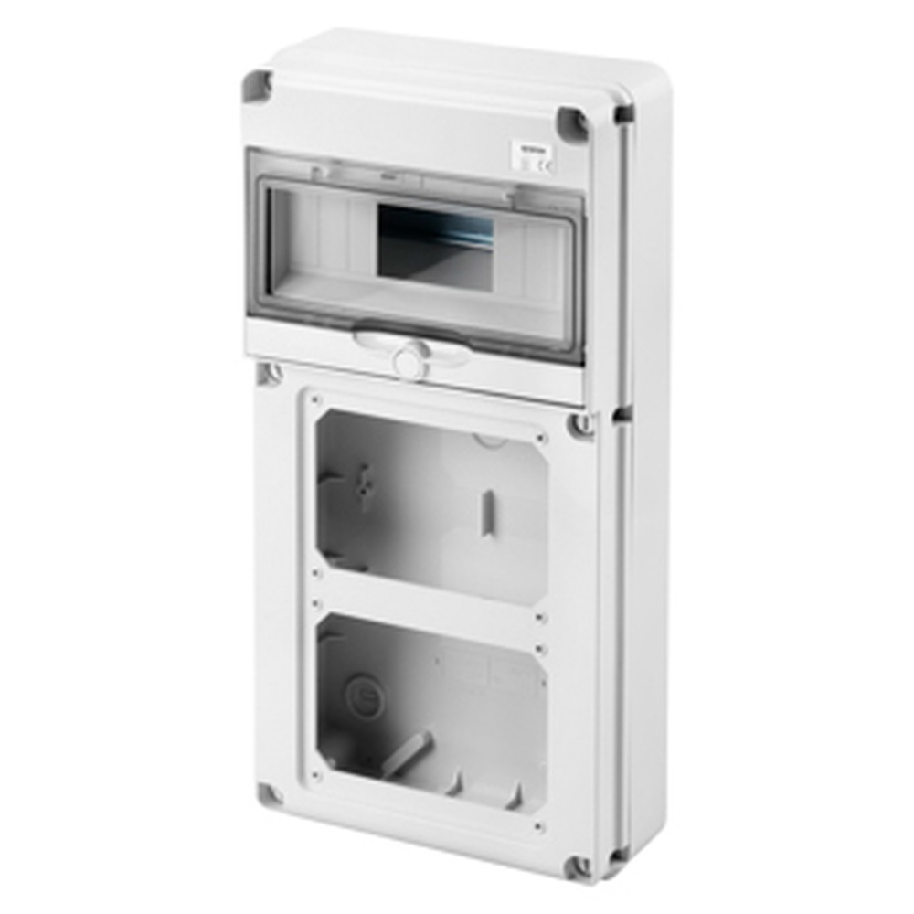Gewiss Kombinationsgehäuse GW68019N IEC Kombinationsgehaeuse mit 2 Flanschen 16A Steckdose schaltbar waag 10TE IP65 IEC Leergehaeuse fuer Steckdosenkombinationen. Mit Flanschoeffnungen zur einfachen und schnellen Montage von IEC Anbausteckdosen. Verteilerraum unter transparenter Abdeckung zur freien Bestueckung mit Reiheneinbaugeraeten. Der Verteilerraum kann durch ein Sicherheitsschloss nachgeruestet werden. Das Oberteil ist durch Verwendung von Kugelkopfschrauben standardmaessig beidseitig als Scharnier ausgefuehrt. 2 Flansche LxB 115x155 mm fuer IEC Steckdosen schaltbar waagerecht 16 32A. 1 Blindflansch ist im Lieferumfang enthalten. Gehaeuseschutzart IP65 Die Schutzart wird durch die Verwendung der Steckdosen und Leitungseinfuehrungen bestimmt . Hersteller Gewiss EAN Nr. 8011564744875 Warengruppe Gewiss Gehäuse