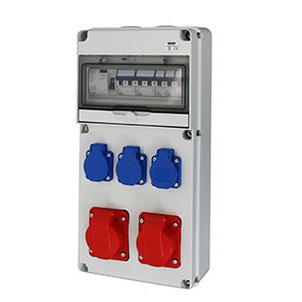 Gewiss Steckdosen DE00319 Steckdosenkombination mit 2 IEC5x16A 3 Schuko mit Einspeiseklemme IEC Steckdosenkombination anschlussfertig verdrahtet. Die Reiheneinbaugeraete sind unter einer transparenten Betaetigungsklappe montiert. Die Betaetigungsklappe kann durch ein Sicherheitsschloss nachgeruestet werden. Das Oberteil ist durch Verwendung von Kugelkopfschrauben standardmaessig beidseitig als Scharnier ausgefuehrt. Das Gehaeuse kann wahlweise innenliegend oder mit Wandlaschen Zubehoer aussenliegend montiert werden. Durch entsprechendes Zubehoer ist eine Umruestung mit Traggriff oder Standrahmen moeglich. Mit je 2 Bohrungen oben und unten. Einschliesslich 1 Kabelverschraubung M32 und 3 Verschlussschrauben M32. Fehlerstromschutzschalter 40 0,03A 4 pol. Typ A, Leitungsschutzschalter C Charakteristik Schaltvermoegen 10kA. Bei Leitungsschutzschaltern in kompakter Ausfuehrung Schaltvermoegen 6kA. Hersteller Gewiss EAN Nr. 8011564817470 Warengruppe Gewiss CEE Steckdosenkombination
