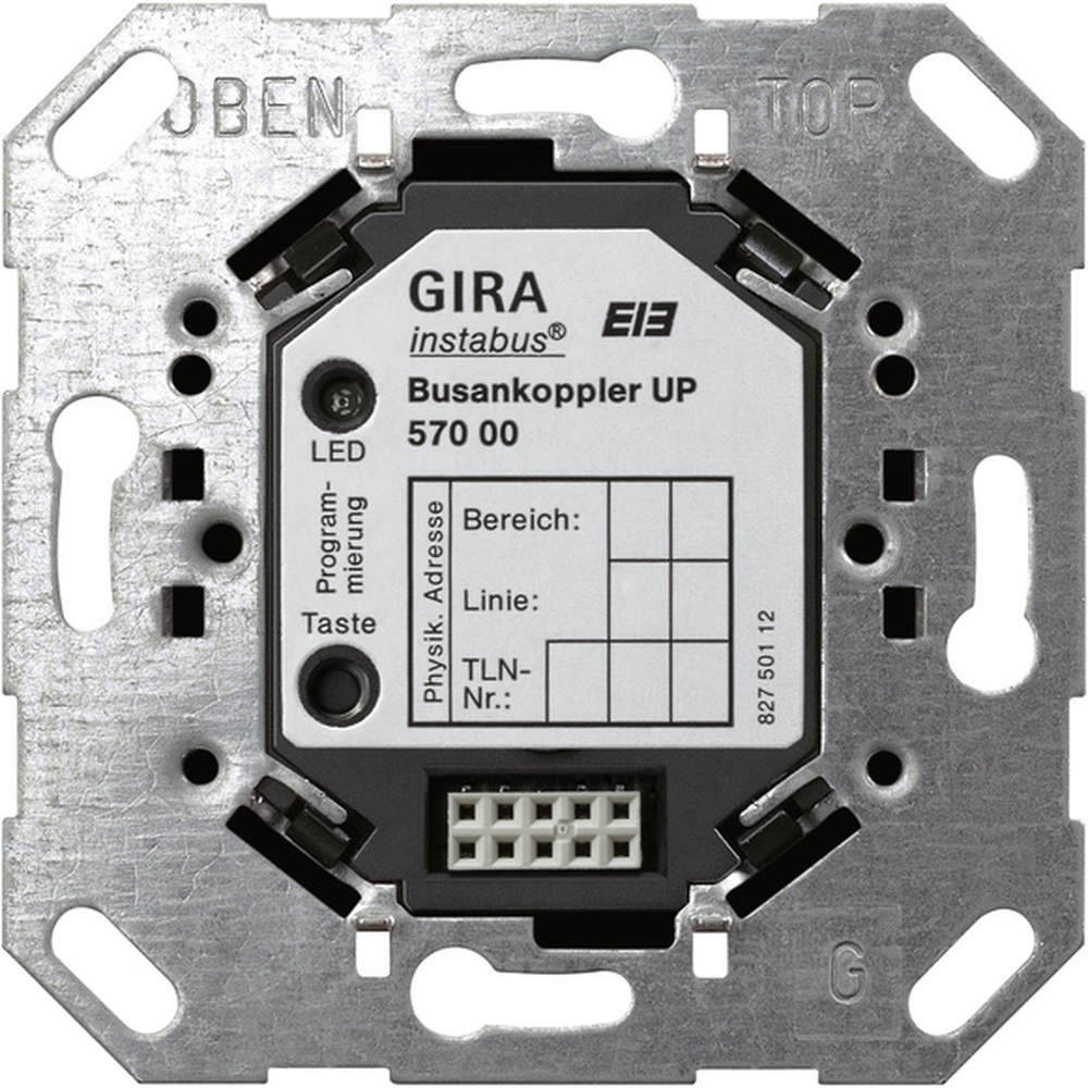 Gira Busankoppler 057000 Busankoppler UP KNX Einsatz Produktfamilie: Systemgeräte Produkttyp: Busankoppler Der UP Busankoppler ist die Schnittstelle zwischen dem Bus und dem Anwender Modul wie z.B. Tastsensor, Info Display, Stetigregler, Datenschnittstelle usw. Die Busankopplung kann Telegramme empfangen, aussenden und auswerten. Sie enthält die Adressen, das Systemprogramm und auch anwenderspezifische Programme. Freigabe der Programmierung der physikalischen Adresse durch Betätigen der Programmiertaste. Zustandsanzeige durch rote Programmier LED. Nur für Schalterdosen mit Schraubbefestigung geeignet. Leistungsaufnahme: max. 150 mW Anschlüsse: KNX über Anschluss und Abzweigklemme Anwender Modul durch Steckverbinder 2x5polig Temperaturbereich 5 C bis +45 C Schutzart: IP20 Abmessungen: Einbautiefe 32 mm EAN Nr. 4010337570004 Warengruppe Gira KNX/EIB