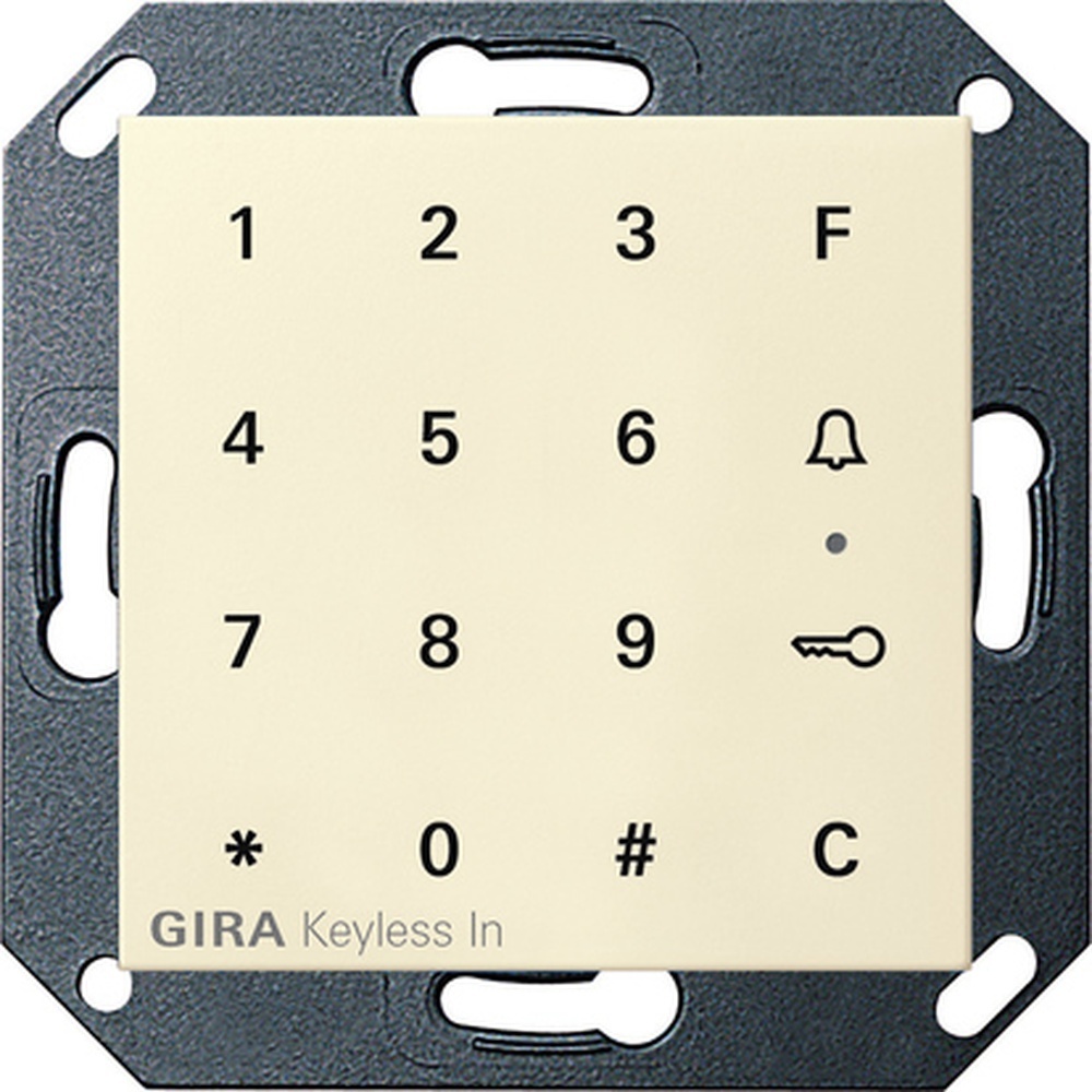 Gira Keyless Codetastatur 260501 Gira Keyless In Codetastatur System 55 Cremeweiß Codetastatur als Zutrittskontrollsystem basierend auf einem kapazitiv wirkenden und damit verschleißfreien Tastenfeld. Die Codetastatur hat folgende Produktmerkmale: Installation in der 58er Unterputzdose.. Kapazitives Tastenfeld. Zur Codeeingabe ist eine leichte Annäherung bzw. Berührung der Ziffer ausreichend. Aufgrund der verschleißfreien kapazitiven Technologie keine erkennbaren Abnutzung häufig benuzter Ziffernkombination.. Ermöglicht als Stand Alone Gerät oder in Kombination mit dem Gira Türkommunikations System eine komfortable Ansteuerung zur Türöffnung für berechtigte Personen sowie ein Türrufsystem für Gebäude mit mehreren Wohneinheiten.. Beim Stand Alone Betrieb werden die im UP Einsatz vorhandenen potentialfreien Relaiskontakte für die Schalthandlungen genutzt, z.B. für Türöffner mit eigener Spannungsversorgung z.B. handelsüblicher Klingeltrafo .. Sondertaste C: Löschen einer Falscheingabe.. Sondertaste Schlüssel: Nach Eingabe des richtigen Codes erfolgt bei Tastenbetätigung eine direkte Türöffnung.. Sondertaste Glocke: Gezielte Anwahl von Wohnungsstationen in großen Objekten.. Sondertaste F: In Verbindung mit Schaltaktoren 1211 00, 1289 00 des Gira Türkommunikations Systems sind hiermit Schaltfunktionen möglich.. Inbetriebnahme durch Direkt Konfiguration am Gerät möglich die Codetastatur wird ohne PC oder Programmiersoftware in Betrieb genommen.. Homogene blaue LED Ausleuchtung der Ziffern und Sonderzeichen bei Nacht.. Designvielfalt durch Integration in die Gira Designplattformen TX_44, System 55. Integration in Flächenschalter und Edelstahl Serie 20, Serie 21 über Adapterrahmen möglich.. Master PIN Nummer auf beiliegender versiegelter Sicherheitskarte bei Verlust der Administrator PIN Nummer.. Die Codetastatur kann bis zu 255 Codes verwalten.. Bis zu 32stellige Codes möglich.. Akustische Rückmeldung bei Tastenbetätigung.. Dreifarbige LED Zustandsanzeige zur optischen Signalisierung bei der Programmierung und während der Bedienung.. Warnton bei unberechtigter Entnahme des Tastaturaufsatzes zur Sabotageerkennung. In Verbindung mit dem Gira Türkommunikations System lässt sich auch eine Sabotageschaltung mittels Schaltaktor realisieren.. Den beiden integrierten Wechsler Relais können zwei unterschiedliche Codes zugeordnet werden, z.B. Code 1: Türöffnung, Code 2: Schalten des Außenlichtes.. Mit dem TKS IP Gateway können die Keyless In Geräte an den Gira HomeServer angebunden werden. Dadurch sind inteligente Verknüpfungen möglich. So können z. B. temporäre oder einmalige Zugangsberechtigungen ganz einfach erteilt werden. Alle Daten inklusive der Zugangsberechtigungen lassen sich dann zentral und flexibel über den Gira HomeServer verwalten. Für diese Funktionserweiterungen werden Keyless In Geräte ab Index 03 und der HomeServer Experte ab Version 2.6 benötigt...Ein und Ausgänge Schaltkontakt: 2 Relais mit potentialfreien Wechsler Kontakten. Belastbarkeit 24 V 1,6 A AC DC. Steckerleiste Systembus Gira Türkommunikations System. 2 Anschlüsse Zusatzversorgung.. Schutzart: IP 20 TX_44 = IP 44 Spannungsversorgung: DC 24 V + 10% Spannungsversorgung 1296 00 bzw. 2DC 6 V + 2 V Türkommunikations Busspannung Temperaturbereich 20 C bis +70 C ESD Festigkeit: bis 16 kV EAN Nr. 4010337051343 Warengruppe Gira System 55