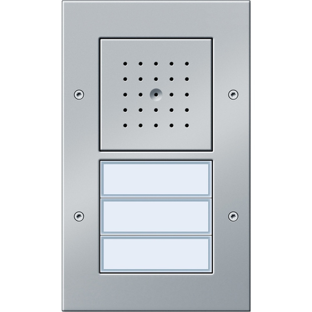 Gira Türstation AP 3fach 126765 Türstation AP 3f Türko Farbe Alu Türstation mit Türlautsprecher und Ruftaster als komplett vormontierte Einheit für die senkrechte Aufputz Montage. Nicht benötigte Ruftasten lassen sich mit der Ruftastenabdeckung 1255 .. abdecken. Die Türstation AP hat folgende Produktmerkmale: Komplett vormontierte Aufputz Türstation, dadurch schnelle und saubere Installation.. Im Design des Gira Schalterprogramms TX_44.. Geringe Bauhöhe von nur 19 mm.. Verwindungssteifes Aufputzgehäuse durch Aluminiumprofil.. Abdeckrahmen aus bruchsicherem Thermoplast mit hoher UV Stabilität sowie einer kratzfesten, pflegeleichten Oberfläche.. Diebstahlschutz mittels Torx Schrauben.. Signalübertragung und Versorgung der Audio und Video Komponenten über den verpolungssicheren und kurzschlussfesten 2 Draht Bus.. In Türkommunikationsanlagen bis zu 30 Teilnehmern einsetzbar.. Einmann Inbetriebnahme durch einfache Inbetriebnahmeprozedur.. Wetterfester Lautsprecher.. Hochwertiges Elektretmikrofon.. Freisprechfunktion Sprachgesteuertes Gegensprechen mit Echo und Hintergrund Geräuschunterdrückung .. Akustisches Quittiersignal bei Ruftastenbetätigung.. Sprachlautstärke einstellbar.. Weiße Ruftastenbeleuchtung in LED Technologie. Durch die wartungsfreie und stromsparende LED Technologie wird eine gleichmäßige, gut sichtbare Ruftastenausleuchtung erreicht.. Spritzwasserdichte Ruftastenabdeckung aus schlagfestem Kunststoff.. Namensschild des Ruftasters ohne Werkzeug und ohne Rahmendemontage austauschbar.. Professionelle Beschriftung über den Gira Beschriftungsservice www.beschriftung.gira.de oder die Gira Beschriftungssoftware... Spannungsversorgung: DC 26 V + 2 V Busspannung Anschlüsse: 2 Schraubklemmen 2 Draht Bus 2 Schraubklemmen Zusatzversorgung Abmessungen: BxHxT 110x181x19 mm Abmessung Namensschilder: BxH 62x18 mm Temperaturbereich 25 C bis +70 C Schutzart: IP44 EAN Nr. 4010337267652 Warengruppe Gira Türkommunikation