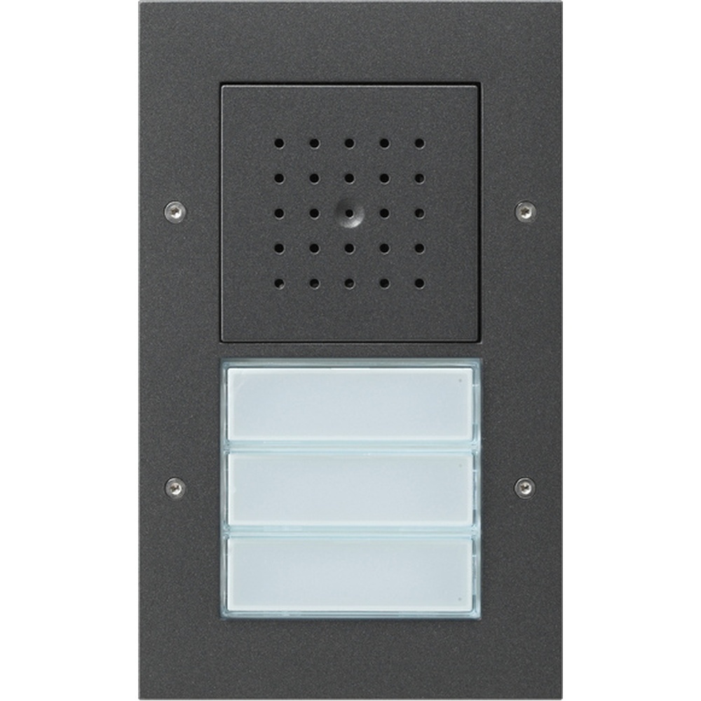 Gira Türstation AP 3fach 126767 Türstation AP 3f Türko Anthrazit Türstation mit Türlautsprecher und Ruftaster als komplett vormontierte Einheit für die senkrechte Aufputz Montage. Nicht benötigte Ruftasten lassen sich mit der Ruftastenabdeckung 1255 .. abdecken. Die Türstation AP hat folgende Produktmerkmale: Komplett vormontierte Aufputz Türstation, dadurch schnelle und saubere Installation.. Im Design des Gira Schalterprogramms TX_44.. Geringe Bauhöhe von nur 19 mm.. Verwindungssteifes Aufputzgehäuse durch Aluminiumprofil.. Abdeckrahmen aus bruchsicherem Thermoplast mit hoher UV Stabilität sowie einer kratzfesten, pflegeleichten Oberfläche.. Diebstahlschutz mittels Torx Schrauben.. Signalübertragung und Versorgung der Audio und Video Komponenten über den verpolungssicheren und kurzschlussfesten 2 Draht Bus.. In Türkommunikationsanlagen bis zu 30 Teilnehmern einsetzbar.. Einmann Inbetriebnahme durch einfache Inbetriebnahmeprozedur.. Wetterfester Lautsprecher.. Hochwertiges Elektretmikrofon.. Freisprechfunktion Sprachgesteuertes Gegensprechen mit Echo und Hintergrund Geräuschunterdrückung .. Akustisches Quittiersignal bei Ruftastenbetätigung.. Sprachlautstärke einstellbar.. Weiße Ruftastenbeleuchtung in LED Technologie. Durch die wartungsfreie und stromsparende LED Technologie wird eine gleichmäßige, gut sichtbare Ruftastenausleuchtung erreicht.. Spritzwasserdichte Ruftastenabdeckung aus schlagfestem Kunststoff.. Namensschild des Ruftasters ohne Werkzeug und ohne Rahmendemontage austauschbar.. Professionelle Beschriftung über den Gira Beschriftungsservice www.beschriftung.gira.de oder die Gira Beschriftungssoftware... Spannungsversorgung: DC 26 V + 2 V Busspannung Anschlüsse: 2 Schraubklemmen 2 Draht Bus 2 Schraubklemmen Zusatzversorgung Abmessungen: BxHxT 110x181x19 mm Abmessung Namensschilder: BxH 62x18 mm Temperaturbereich 25 C bis +70 C Schutzart: IP44 EAN Nr. 4010337267676 Warengruppe Gira Türkommunikation