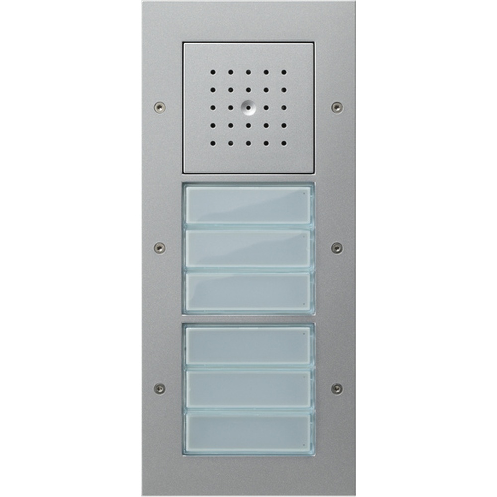Gira Türstation AP 6fach 126865 Türstation AP 6f Türko Farbe Alu Türstation mit Türlautsprecher und Ruftaster als komplett vormontierte Einheit für die senkrechte Aufputz Montage. Nicht benötigte Ruftasten lassen sich mit der Ruftastenabdeckung 1255 .. abdecken. Die Türstation AP hat folgende Produktmerkmale: Komplett vormontierte Aufputz Türstation, dadurch schnelle und saubere Installation.. Im Design des Gira Schalterprogramms TX_44.. Geringe Bauhöhe von nur 19 mm.. Verwindungssteifes Aufputzgehäuse durch Aluminiumprofil.. Abdeckrahmen aus bruchsicherem Thermoplast mit hoher UV Stabilität sowie einer kratzfesten, pflegeleichten Oberfläche.. Diebstahlschutz mittels Torx Schrauben.. Signalübertragung und Versorgung der Audio und Video Komponenten über den verpolungssicheren und kurzschlussfesten 2 Draht Bus.. In Türkommunikationsanlagen bis zu 30 Teilnehmern einsetzbar.. Einmann Inbetriebnahme durch einfache Inbetriebnahmeprozedur.. Wetterfester Lautsprecher.. Hochwertiges Elektretmikrofon.. Freisprechfunktion Sprachgesteuertes Gegensprechen mit Echo und Hintergrund Geräuschunterdrückung .. Akustisches Quittiersignal bei Ruftastenbetätigung.. Sprachlautstärke einstellbar.. Weiße Ruftastenbeleuchtung in LED Technologie. Durch die wartungsfreie und stromsparende LED Technologie wird eine gleichmäßige, gut sichtbare Ruftastenausleuchtung erreicht.. Spritzwasserdichte Ruftastenabdeckung aus schlagfestem Kunststoff.. Namensschild des Ruftasters ohne Werkzeug und ohne Rahmendemontage austauschbar.. Professionelle Beschriftung über den Gira Beschriftungsservice www.beschriftung.gira.de oder die Gira Beschriftungssoftware... Spannungsversorgung: DC 26 V + 2 V Busspannung Anschlüsse: 2 Schraubklemmen 2 Draht Bus 2 Schraubklemmen Zusatzversorgung Abmessungen: 1fach, 3fach BxHxT 110x181x19 mm 6fach BxHxT 110x253x19 mm Abmessung Namensschilder: BxH 62x18 mm Temperaturbereich 25 C bis +70 C Schutzart: IP44 EAN Nr. 4010337003885 Warengruppe Gira Türkommunikation